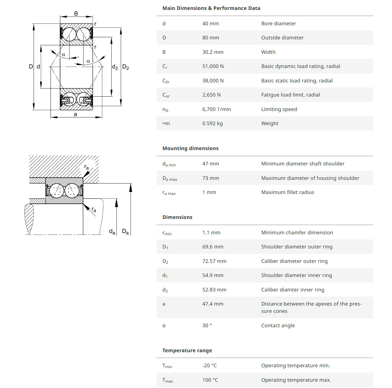 FAG 3208-BD-XL-2HRS-TVH มีขนาดวงใน 40 มิล วงนอก 80 มิล หนา 30.2 มิล เป็นตลับลูกปืนเม็ดกลมแบบมีมุมสัมผัส 30° องศา แบบสองแถว มีฝายางปิดสองด้าน เหมาะสำหรับรองรับแรงโหลดได้มากทั้งในแนวรัศมีและแนวแกน