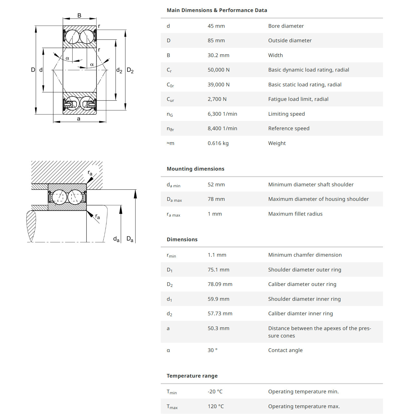 FAG 3209-BD-XL-2Z-TVH มีขนาดวงใน 45 มิล วงนอก 85 มิล หนา 30.2 มิล เป็นตลับลูกปืนเม็ดกลมแบบมีมุมสัมผัส 30° องศา แบบสองแถว มีฝาเหล็กปิดสองด้าน เหมาะสำหรับรองรับแรงโหลดได้มากทั้งในแนวรัศมีและแนวแกน
