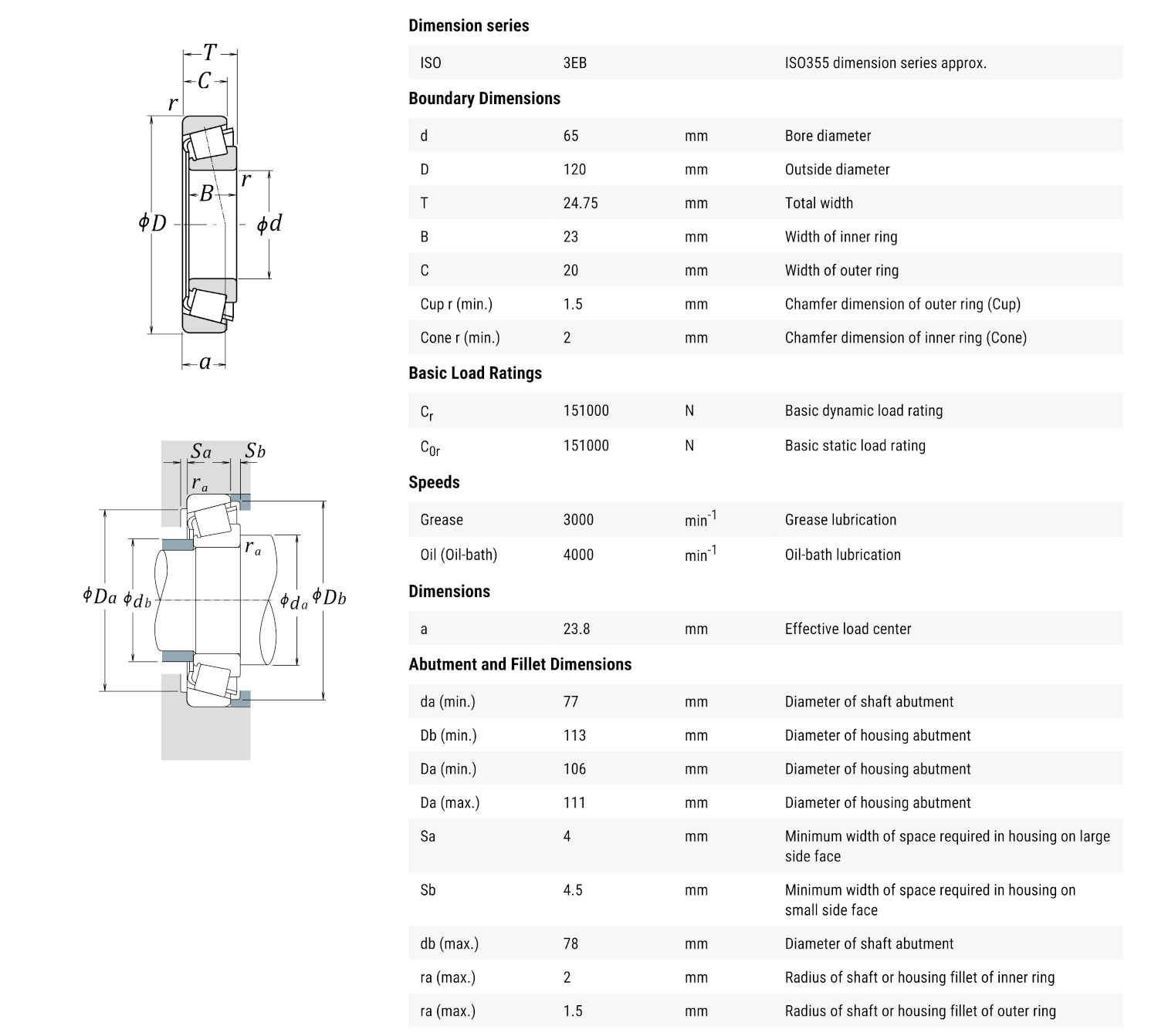 NSK HR30213J มีขนาดวงใน 65 มิล วงนอก 120 มิล หนารวม 24.75 มิล เป็นตลับลูกปืนเม็ดเรียว หรือที่เรียกว่า เตเปอร์(Tapered) แกนนอกมีลักษณะเป็นปลอกคล้ายถ้วย(Cup) แยกออกจากตัวลูกปืน(Cone)ได้ ทำให้สะดวกต่อการติดตั้ง สามารถรองรับแรงโหลดได้สูงทั้งแนวรัศมีและแนวแกน