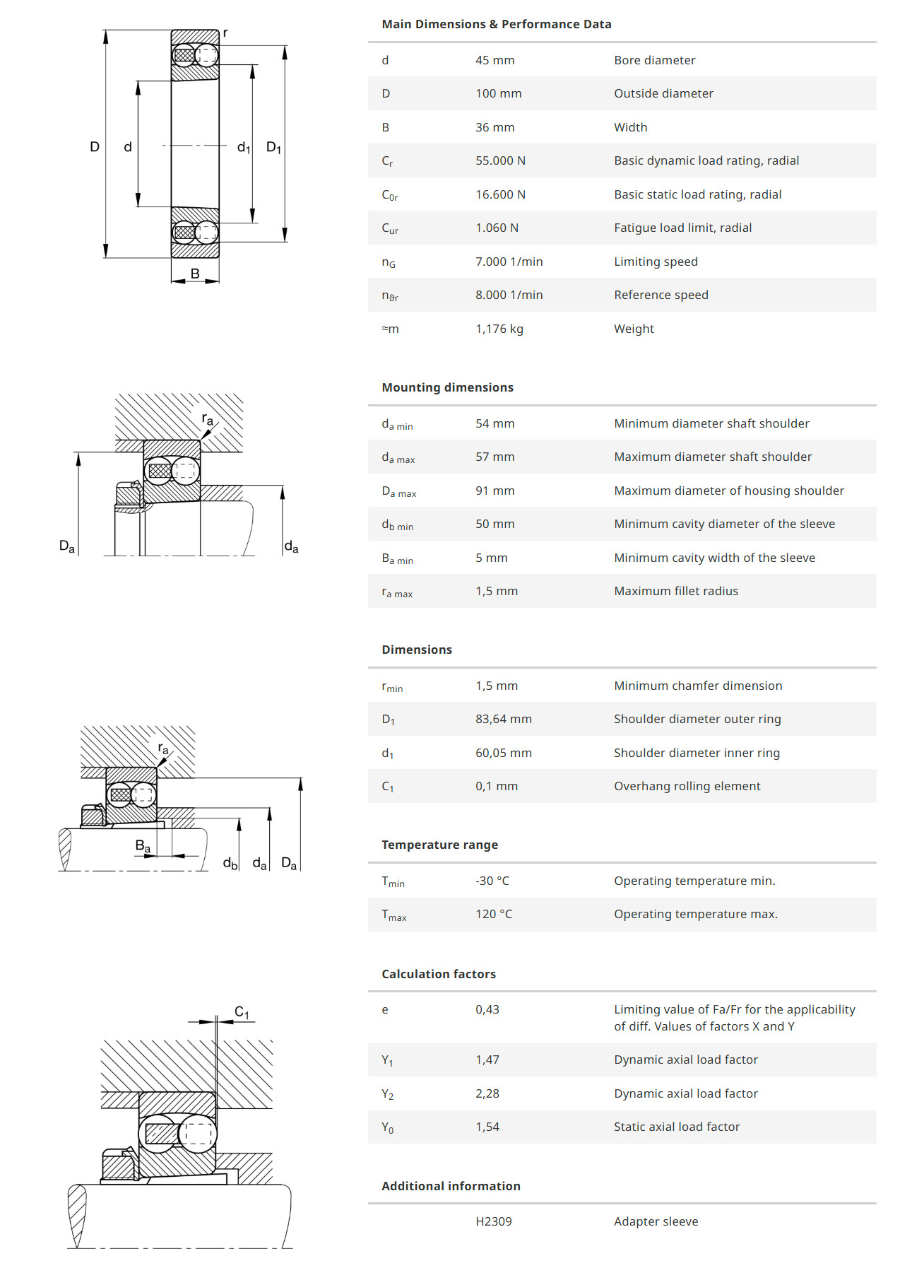 FAG 2309-K-TVH-C3 มีขนาดวงใน 45 มิล วงนอก 100 มิล หนา 36 มิล เป็นตลับลูกปืนเม็ดกลมสองแถวแบบปรับแนวได้เอง ไม่มีฝาปิด แกนในรูเรียว รองรับแรงจากการเยื้องศูนย์ของเพลาได้ดี ความร้อนต่ำแม้ทำงานด้วยความเร็วรอบสูง