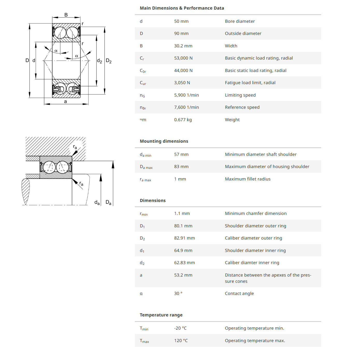 FAG 3210-BD-XL-2Z-TVH มีขนาดวงใน 50 มิล วงนอก 90 มิล หนา 30.2 มิล เป็นตลับลูกปืนเม็ดกลมแบบมีมุมสัมผัส 30° องศา แบบสองแถว มีฝาเหล็กปิดสองด้าน เหมาะสำหรับรองรับแรงโหลดได้มากทั้งในแนวรัศมีและแนวแกน