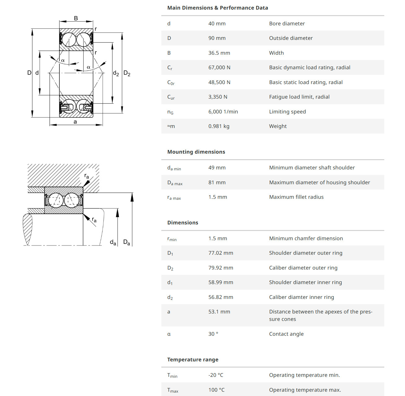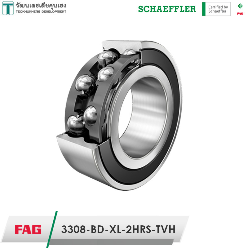 FAG 3308-BD-XL-2HRS-TVH มีขนาดวงใน 40 มิล วงนอก 90 มิล หนา 36.5 มิล เป็นตลับลูกปืนเม็ดกลมแบบมีมุมสัมผัส 30° องศา แบบสองแถว มีฝายางสองด้าน เหมาะสำหรับรองรับแรงโหลดได้มากทั้งในแนวรัศมีและแนวแกน