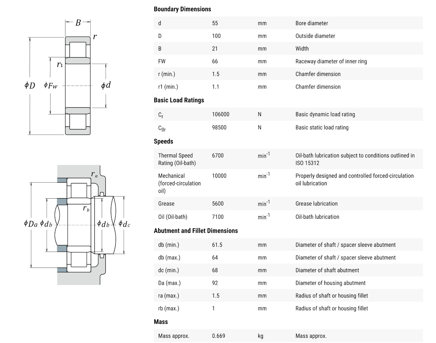 NSK NU 211 EWC3 มีขนาดวงใน 55 มิล วงนอก 100 มิล หนา 21 มิล เป็นตลับลูกปืนเม็ดทรงกระบอกแถวเดียว รังเหล็ก มีลักษณะแกนในที่สามารถถอดหลุดออกได้ทั้ง 2 ด้าน ทำให้สะดวกต่อการติดตั้ง รองรับแรงโหลดได้สูงมาก