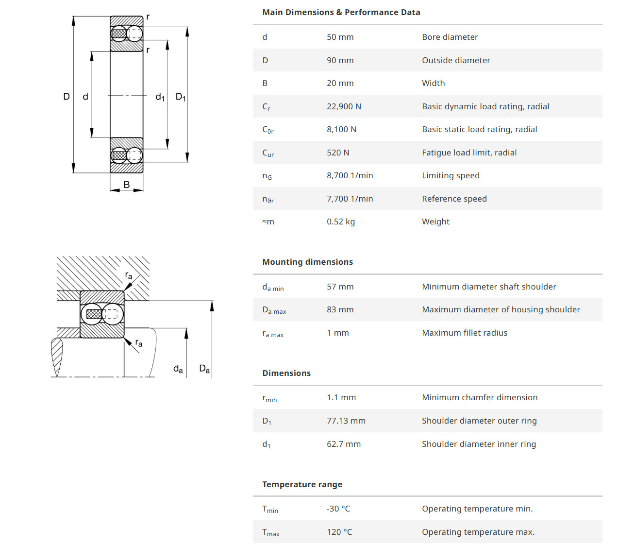 FAG 1210-TVH มีขนาดวงใน 50 มิล วงนอก 90 มิล หนา 20 มิล เป็นตลับลูกปืนเม็ดกลมสองแถว แบบปรับแนวได้เอง ไม่มีฝาปิด แกนในรูตรง รองรับแรงจากการเยื้องศูนย์ของเพลาได้ดี ความร้อนต่ำแม้ทำงานด้วยความเร็วรอบสูง