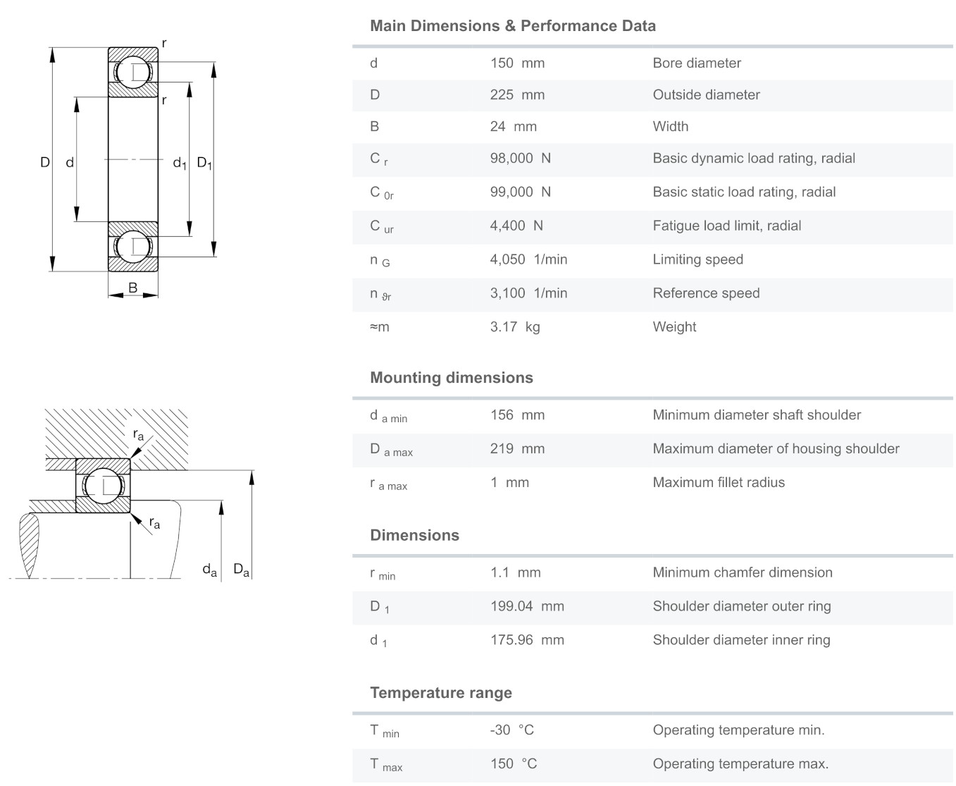 FAG 16030 มีขนาดวงใน 150 มิล วงนอก 225 มิล หนา 24 มิล เป็นตลับลูกปืนเม็ดกลมร่องลึก ไม่มีฝาปิด แถวเดียว รังเหล็ก มีแรงเสียดทานต่ำ เสียงเงียบ สามารถรองรับความเร็วรอบสูง รองรับแรงทั้งแนวรัศมีและแนวแกน