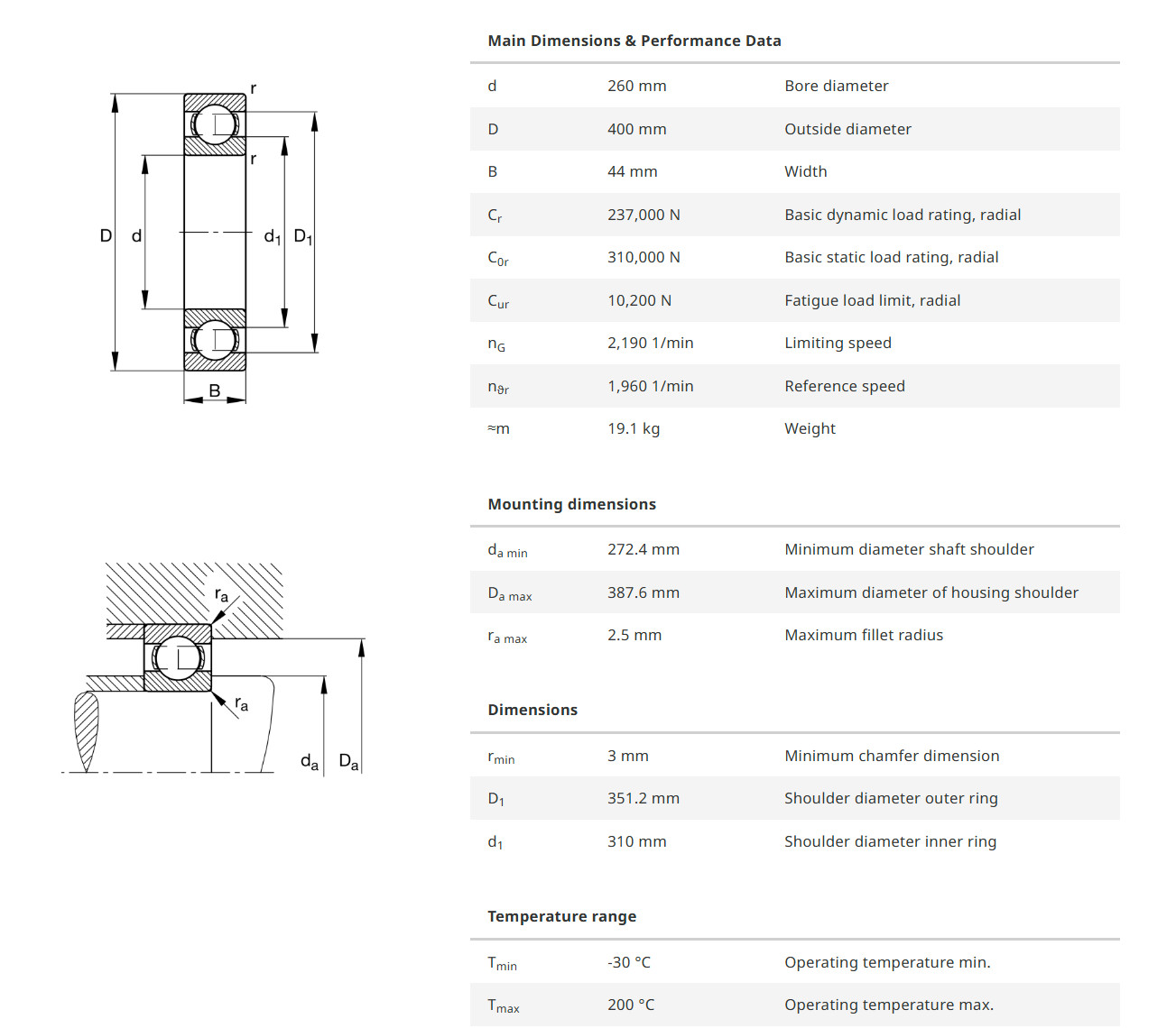 FAG 16052 มีขนาดวงใน 260 มิล วงนอก 400 มิล หนา 44 มิล เป็นตลับลูกปืนเม็ดกลมร่องลึก รังเหล็ก ไม่มีฝา แถวเดียว มีแรงเสียดทานต่ำ เสียงเงียบ สามารถรองรับความเร็วรอบสูง รองรับแรงทั้งแนวรัศมีและแนวแกน