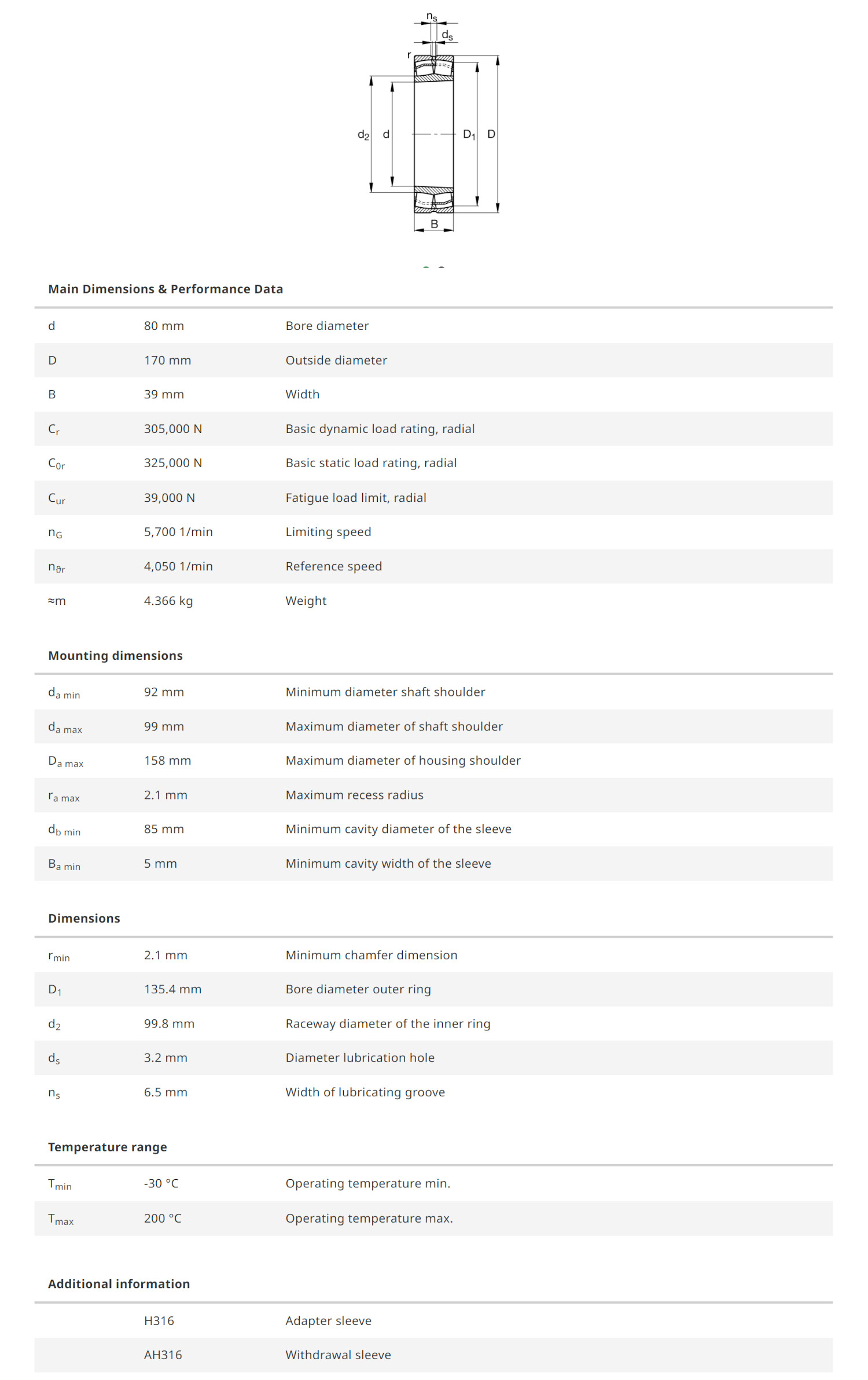 FAG 21316-E1-XL-K มีขนาดวงใน 80 มิล วงนอก 170 มิล หนา 39 มิล เป็นตลับลูกปืนเม็ดโค้งสองแถวแบบให้ตัวได้ แกนในรูเรียว มีรูสำหรับเติมจารบีได้ สามารถรองรับแรงโหลดสูงทั้งในแนวรัศมีและแนวแกน