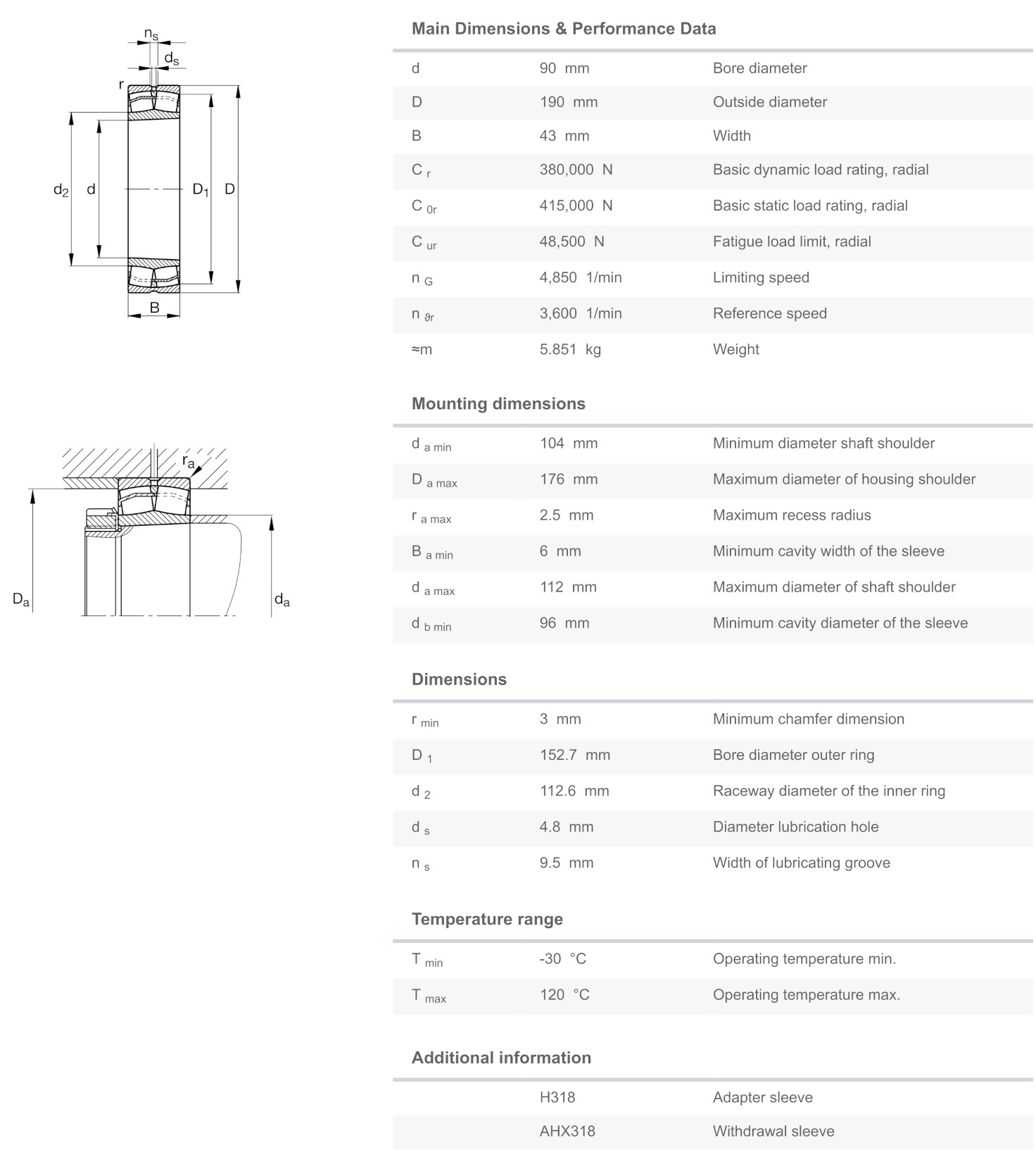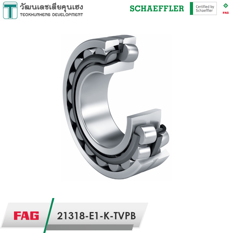 FAG 21318-E1-K-TVPB มีขนาดวงใน 90 มิล วงนอก 190 มิล หนา 43 มิล เป็นตลับลูกปืนเม็ดโค้งสองแถวแบบให้ตัวได้ แกนในรูเรียว มีรูสำหรับเติมจารบีได้ สามารถรองรับแรงโหลดสูงทั้งในแนวรัศมีและแนวแกน