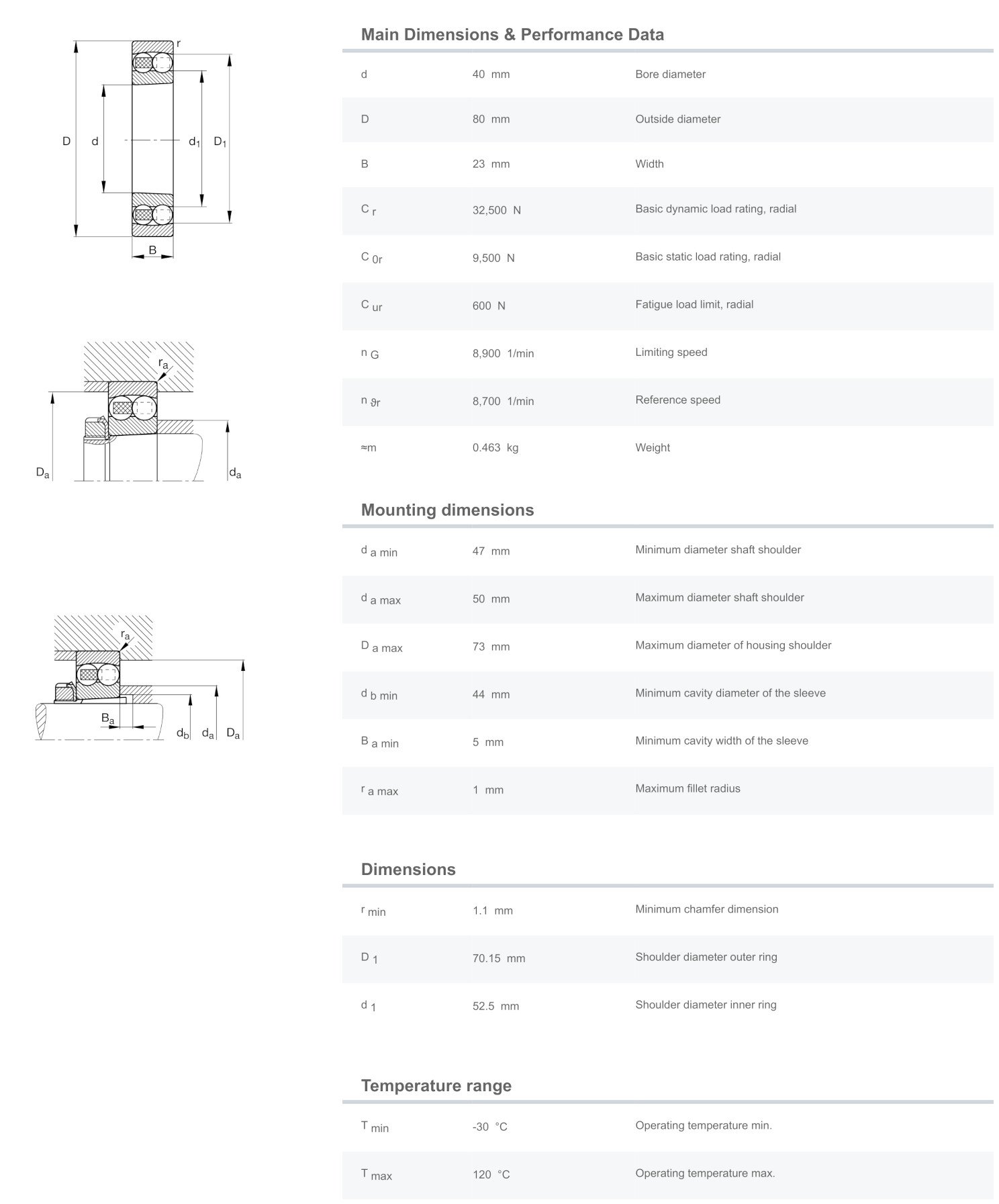 FAG 2208-K-TVH-C3 มีขนาดวงใน 40 มิล วงนอก 80 มิล หนา 23 มิล เป็นตลับลูกปืนเม็ดกลมสองแถว แบบปรับแนวได้เอง แกนในรูเรียว รองรับแรงจากการเยื้องศูนย์ของเพลาได้ดี ความร้อนต่ำแม้ทำงานด้วยความเร็วรอบสูง