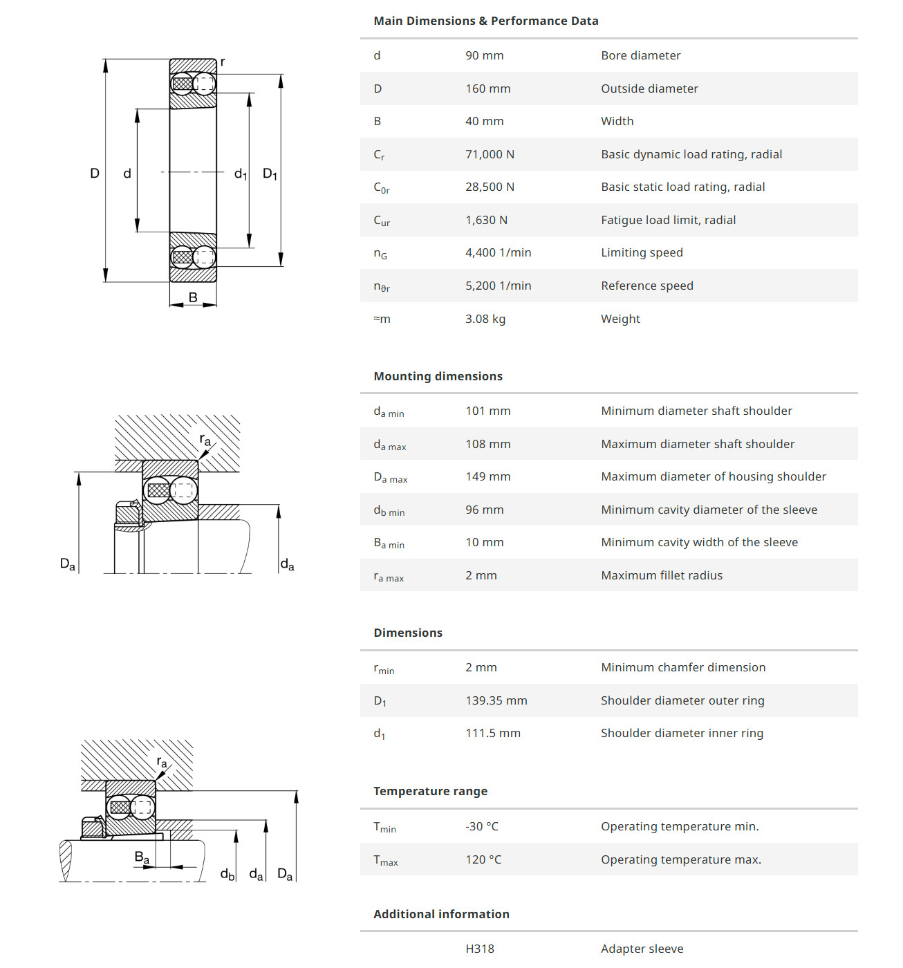 FAG 2218-K-TVH-C3 มีขนาดวงใน 90 มิล วงนอก 160 มิล หนา 40 มิล เป็นตลับลูกปืนเม็ดกลมสองแถวแบบปรับแนวได้เอง แกนในรูเรียว รองรับแรงจากการเยื้องศูนย์ของเพลาได้ดี ความร้อนต่ำแม้ทำงานด้วยความเร็วรอบสูง