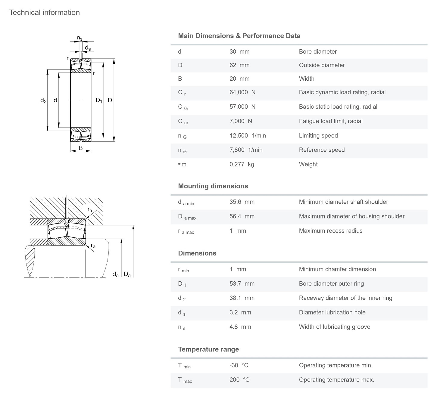 FAG 22206 E1-XL มีขนาดวงใน 30 มิล วงนอก 62 มิล หนา 20 มิล เป็นตลับลูกปืนเม็ดโค้งสองแถวแบบให้ตัวได้ แกนในรูตรง มีร่องตรงกลางตัวลูกปืน และรูสำหรับเติมจารบีได้ สามารถรองรับแรงโหลดสูง ทั้งในแนวรัศมีและแนวแกน
