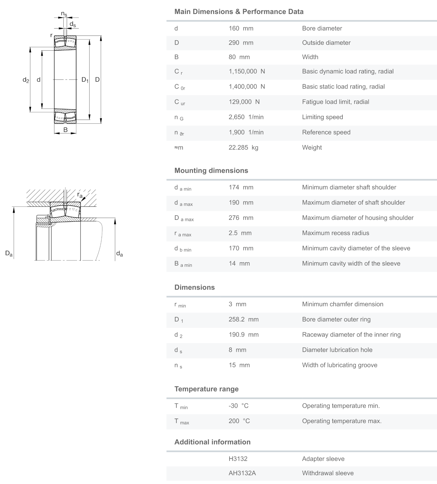 FAG 22232-E1-XL-K-C3 มีขนาดวงใน 160 มิล วงนอก 290 มิล หนา 80 มิล เป็นตลับลูกปืนเม็ดโค้งสองแถวแบบให้ตัวได้ แกนในรูเฉียง มีรูสำหรับเติมจารบีได้ สามารถรองรับแรงโหลดสูงทั้งในแนวรัศมีและแนวแกน