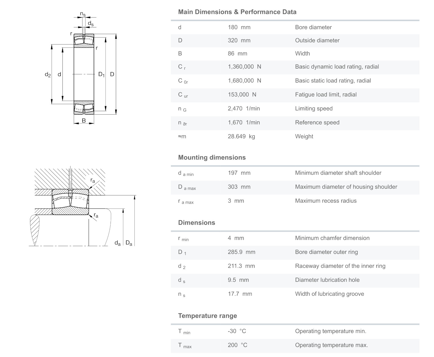 FAG 22236-E1-XL มีขนาดวงใน 180 มิล วงนอก 320 มิล หนา 86 มิล เป็นตลับลูกปืนเม็ดโค้งสองแถวแบบให้ตัวได้ แกนในรูตรง มีรูสำหรับเติมจารบีได้ สามารถรองรับแรงโหลดสูงทั้งในแนวรัศมีและแนวแกน