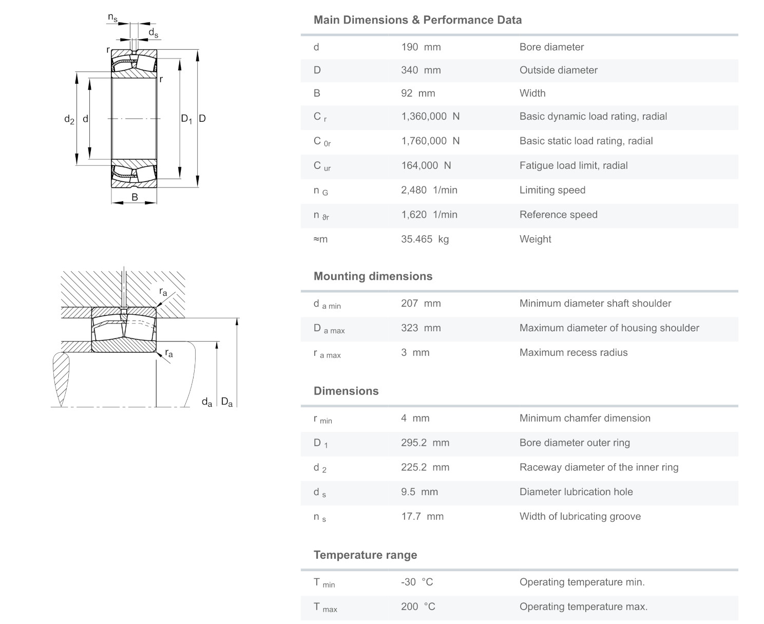 FAG 22238-BE-XL มีขนาดวงใน 190 มิล วงนอก 340 มิล หนา 92 มิล เป็นตลับลูกปืนเม็ดโค้งสองแถวแบบให้ตัวได้ แกนในรูตรง มีรูสำหรับเติมจารบีได้ สามารถรองรับแรงโหลดสูงทั้งในแนวรัศมีและแนวแกน