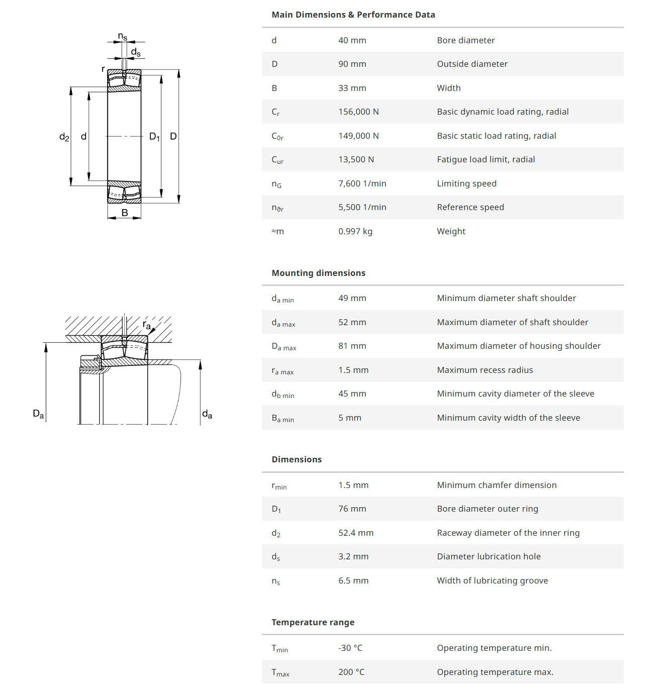 FAG 22308-E1-XL มีขนาดวงใน 40 มิล วงนอก 90 มิล หนา 33 มิล เป็นตลับลูกปืนเม็ดโค้งสองแถวแบบให้ตัวได้ เป็นลูกปืนแกนในรูเรียว มีรูสำหรับเติมจารบีได้ สามารถรองรับแรงโหลดสูงทั้งในแนวรัศมีและแนวแกน แบริ่งอุตสาหกรรม