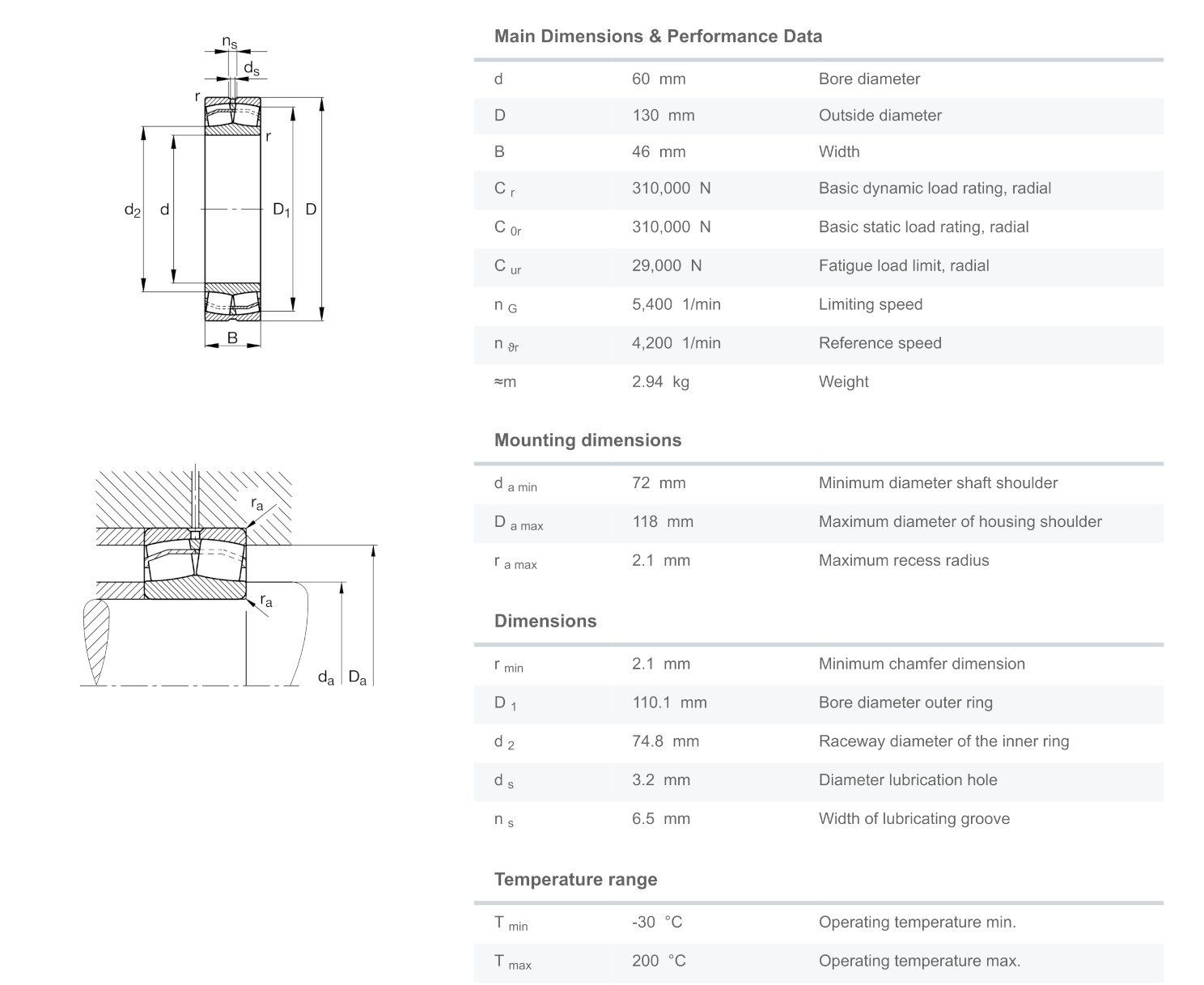 FAG 22312-E1-XL มีขนาดวงใน 60 มิล วงนอก 130 มิล หนา 46 มิล เป็นตลับลูกปืนเม็ดโค้งสองแถวแบบให้ตัวได้ เป็นลูกปืนแกนในรูตรง มีรูสำหรับเติมจารบีได้ สามารถรองรับแรงโหลดสูงทั้งในแนวรัศมีและแนวแกน