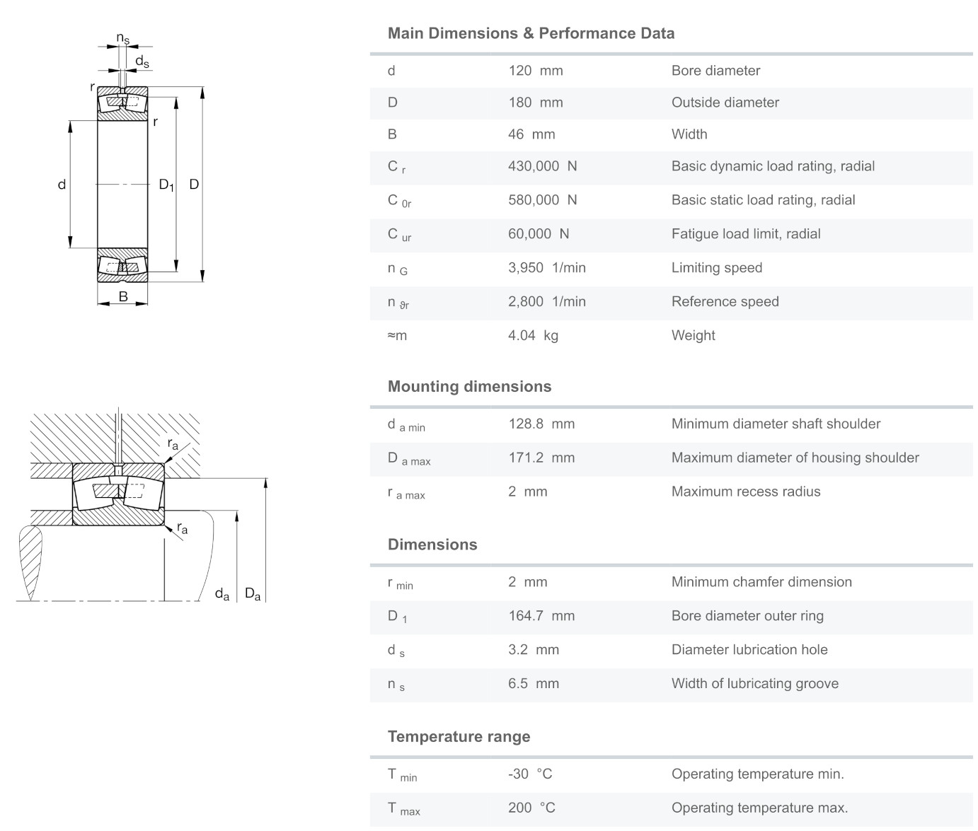 FAG 23024-E1A-XL-M-C3 มีขนาดวงใน 120 มิล วงนอก 180 มิล หนา 46 มิล เป็นตลับลูกปืนเม็ดโค้งสองแถวแบบให้ตัวได้ เป็นลูกปืนแกนในรูตรง มีรูสำหรับเติมจารบีได้ สามารถรองรับแรงโหลดสูงทั้งในแนวรัศมีและแนวแกน