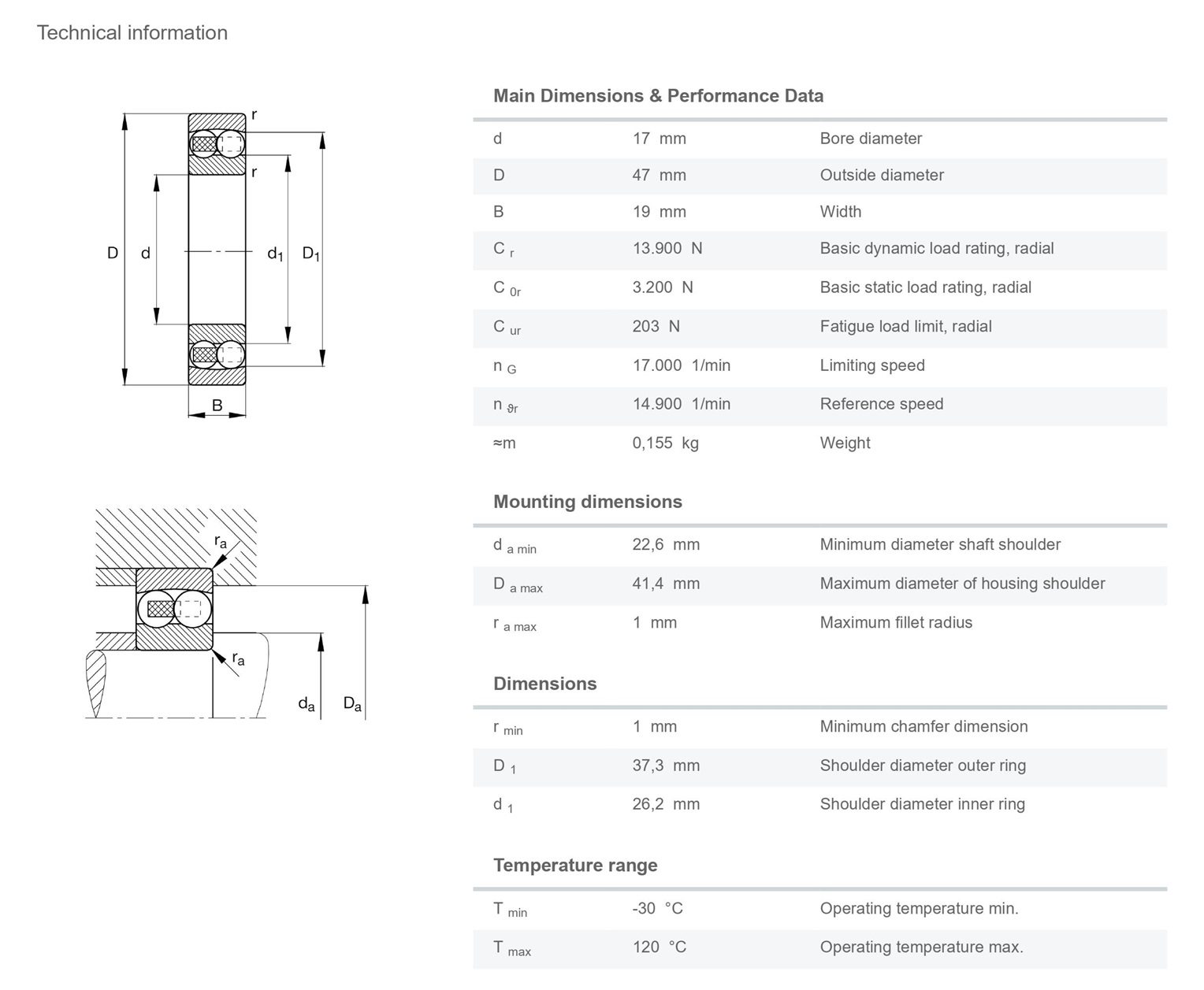 FAG 2303-TVH มีขนาดวงใน 17 มิล วงนอก 47 มิล หนา 19 มิล เป็นตลับลูกปืนเม็ดกลมสองแถว แบบปรับแนวได้เอง รองรับแรงจากการเยื้องศูนย์ของเพลาได้ดี ความร้อนต่ำแม้ทำงานด้วยความเร็วรอบสูง