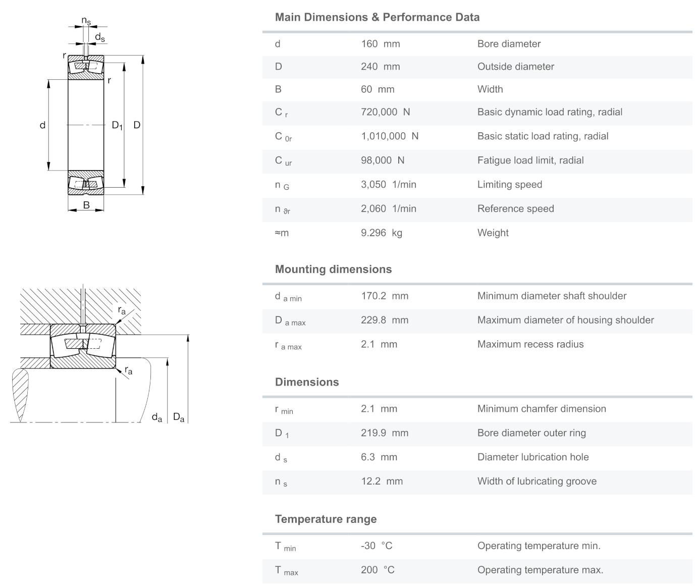FAG 23032-E1A-XL-M-C3 มีขนาดวงใน 160 มิล วงนอก 240 มิล หนา 60 มิล เป็นตลับลูกปืนเม็ดโค้งสองแถวแบบให้ตัวได้ แกนในรูตรง มีรูสำหรับเติมจารบีได้ สามารถรองรับแรงโหลดสูงทั้งในแนวรัศมีและแนวแกน