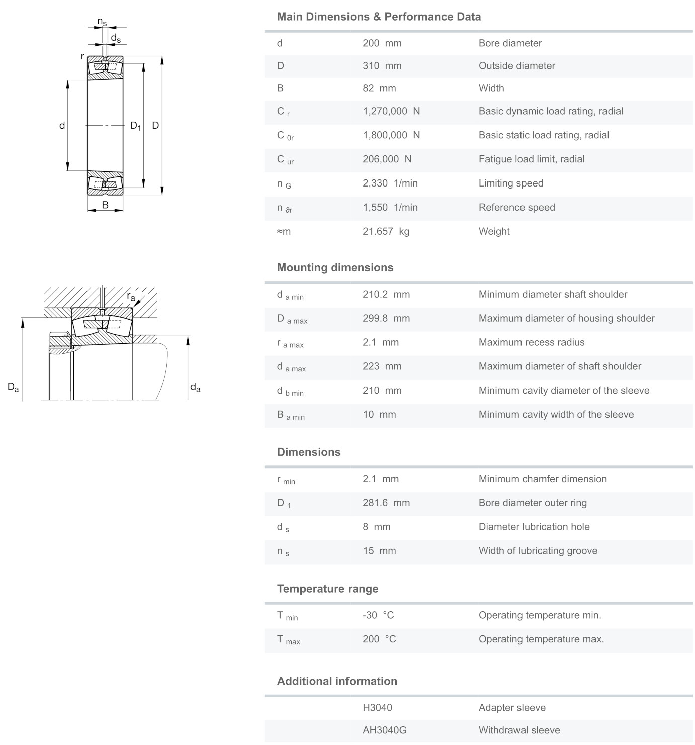 FAG 23040-E1A-XL-K-M-C3 มีขนาดวงใน 200 มิล วงนอก 310 มิล หนา 82 มิล เป็นตลับลูกปืนเม็ดโค้งสองแถวแบบให้ตัวได้ เป็นลูกปืนแกนในรูเฉียง มีรูสำหรับเติมจารบีได้ สามารถรองรับแรงโหลดสูงทั้งในแนวรัศมีและแนวแกน