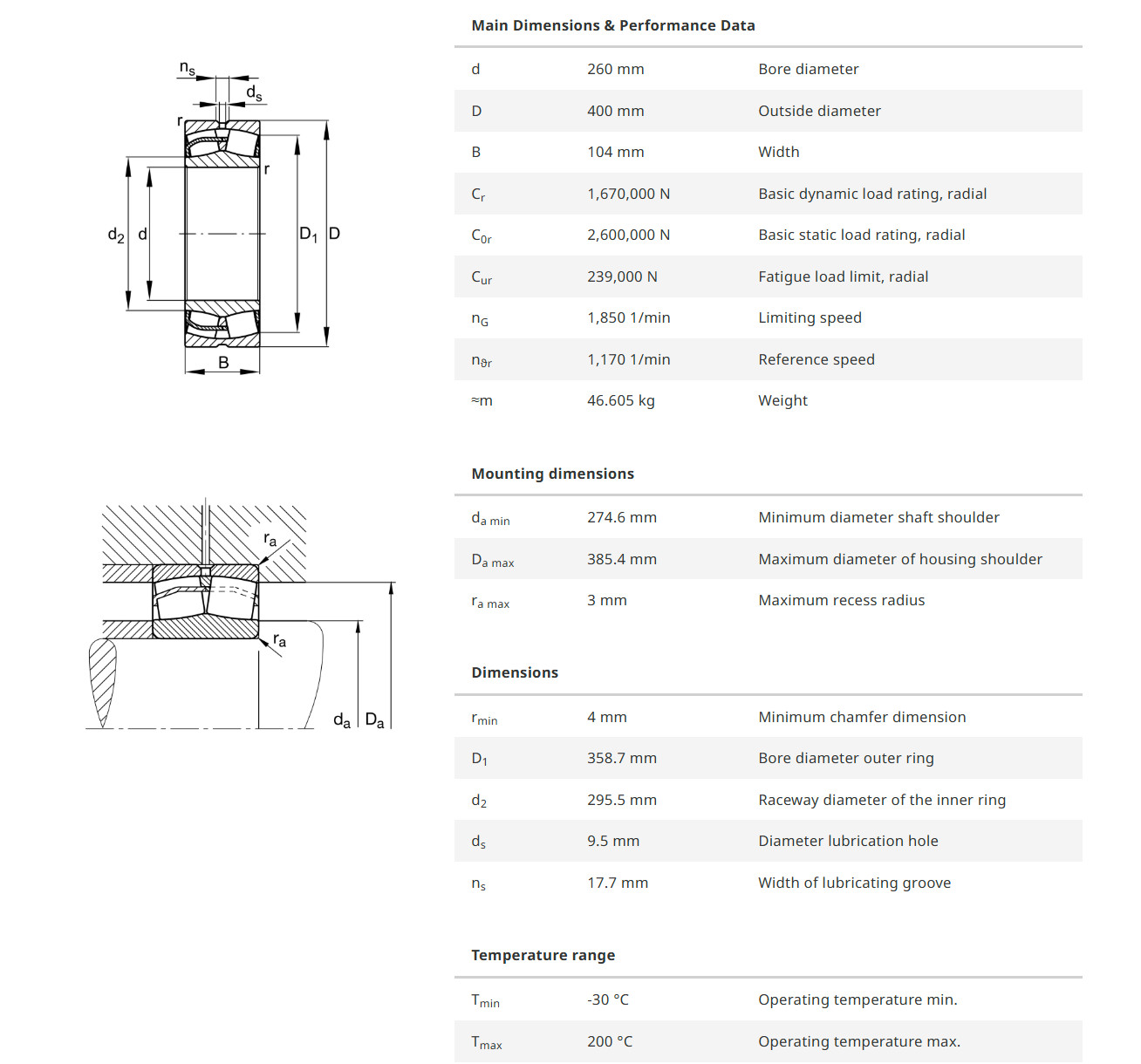 FAG 23052-E1 มีขนาดวงใน 260 มิล วงนอก 400 มิล หนา 104 มิล เป็นตลับลูกปืนเม็ดโค้งสองแถวแบบให้ตัวได้ เป็นลูกปืนแกนในรูตรง มีรูสำหรับเติมจารบีได้ สามารถรองรับแรงโหลดสูงทั้งในแนวรัศมีและแนวแกน เหมาะสำหรับอุตสาหกรรมหนัก