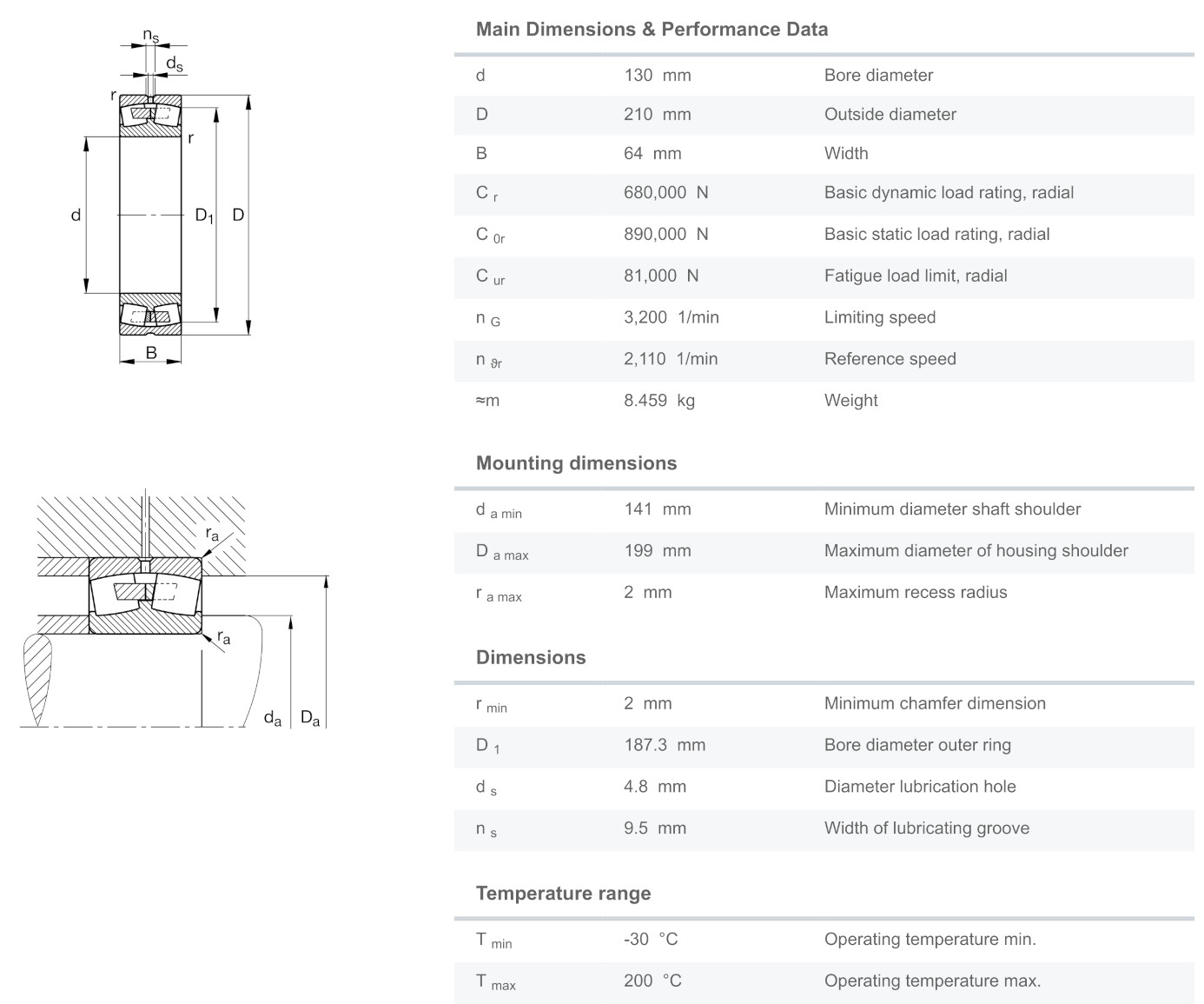 FAG 23126-E1A-M มีขนาดวงใน 130 มิล วงนอก 210 มิล หนา 64 มิล เป็นตลับลูกปืนเม็ดโค้งสองแถวแบบให้ตัวได้ แกนในรูตรง มีรูสำหรับเติมจารบีได้ สามารถรองรับแรงโหลดสูงทั้งในแนวรัศมีและแนวแกน