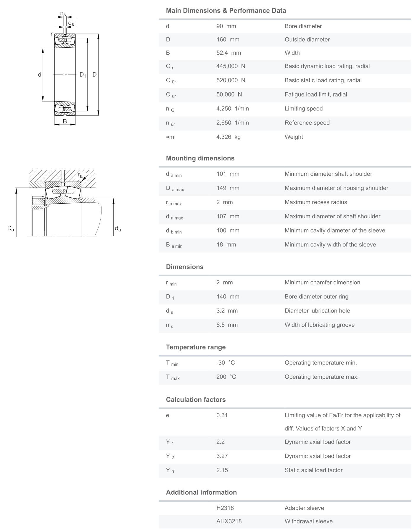 FAG 23218-E1A-XL-K-M-C3 มีขนาดวงใน 90 มิล วงนอก 160 มิล หนา 52.4 มิล เป็นตลับลูกปืนเม็ดโค้งสองแถวแบบให้ตัวได้ แกนในรูเฉียง มีรูสำหรับเติมจารบีได้ สามารถรองรับแรงโหลดสูงทั้งในแนวรัศมีและแนวแกน