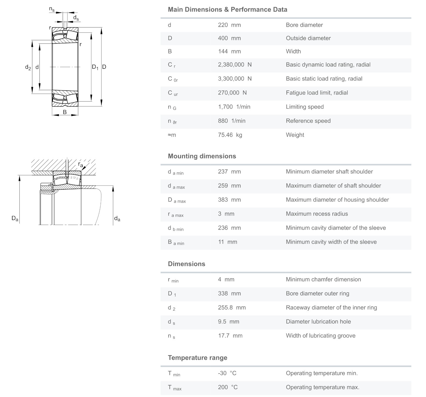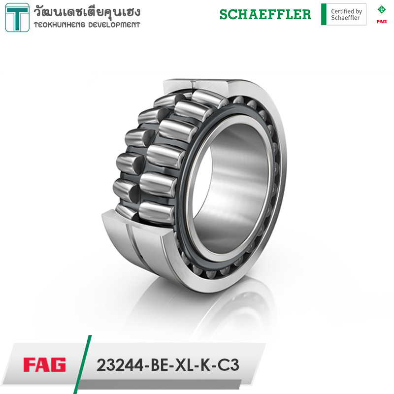 FAG 23244-BE-XL-K-C3 มีขนาดวงใน 220 มิล วงนอก 400 มิล หนา 144 มิล เป็นตลับลูกปืนเม็ดโค้งสองแถวแบบให้ตัวได้ เป็นลูกปืนแกนในรูเฉียง มีรูสำหรับเติมจารบีได้ สามารถรองรับแรงโหลดสูงทั้งในแนวรัศมีและแนวแกน