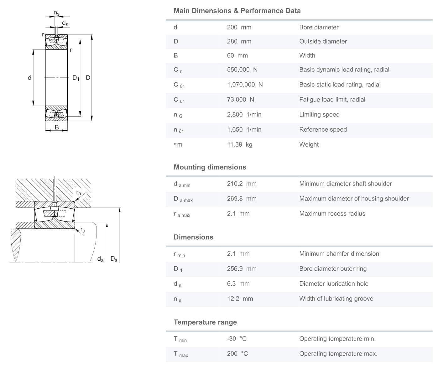 FAG 23940-S-MB-C3 มีขนาดวงใน 200 มิล วงนอก 280 มิล หนา 60 มิล เป็นตลับลูกปืนเม็ดโค้งสองแถวแบบให้ตัวได้ เป็นลูกปืนแกนในรูตรง มีรูสำหรับเติมจารบีได้ สามารถรองรับแรงโหลดสูงทั้งในแนวรัศมีและแนวแกน