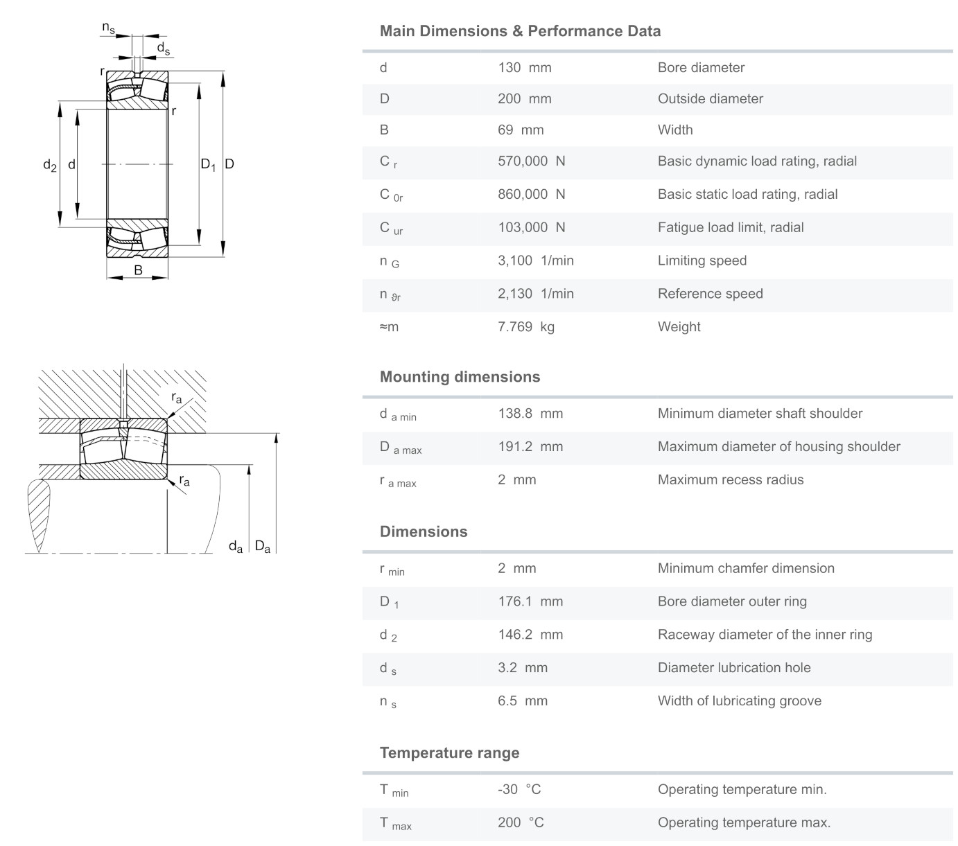 FAG 24026-BE-XL-C3 มีขนาดวงใน 130 มิล วงนอก 200 มิล หนา 69 มิล เป็นตลับลูกปืนเม็ดโค้งสองแถวแบบให้ตัวได้ เป็นลูกปืนแกนในรูตรง มีรูสำหรับเติมจารบีได้ สามารถรองรับแรงโหลดสูงทั้งในแนวรัศมีและแนวแกน