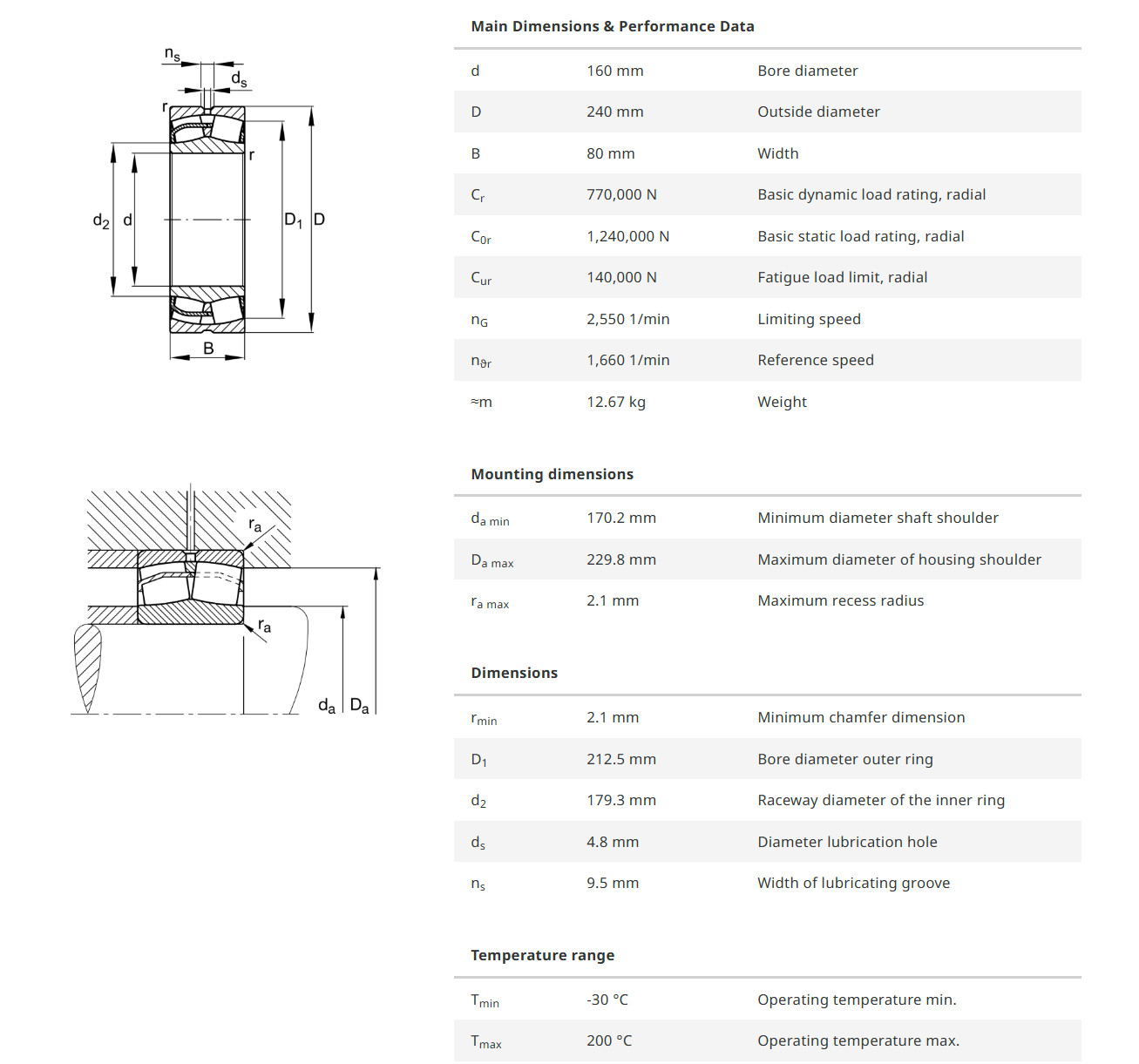 FAG 24032-BE-XL-C3 มีขนาดวงใน 160 มิล วงนอก 240 มิล หนา 80 มิล เป็นตลับลูกปืนเม็ดโค้งสองแถวแบบให้ตัวได้ เป็นลูกปืนแกนในรูตรง มีรูสำหรับเติมจารบีได้ สามารถรองรับแรงโหลดสูงทั้งในแนวรัศมีและแนวแกน