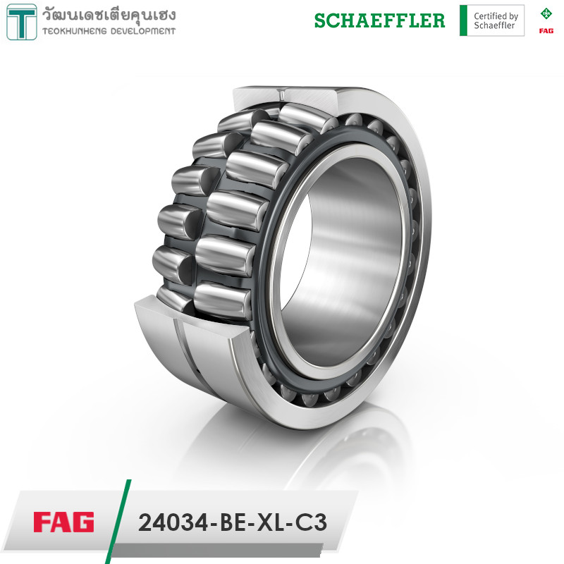 FAG 24034-BE-XL-C3 มีขนาดวงใน 170 มิล วงนอก 260 มิล หนา 90 มิล เป็นตลับลูกปืนเม็ดโค้งสองแถวแบบให้ตัวได้ เป็นลูกปืนแกนในรูตรง มีรูสำหรับเติมจารบีได้ สามารถรองรับแรงโหลดสูงทั้งในแนวรัศมีและแนวแกน