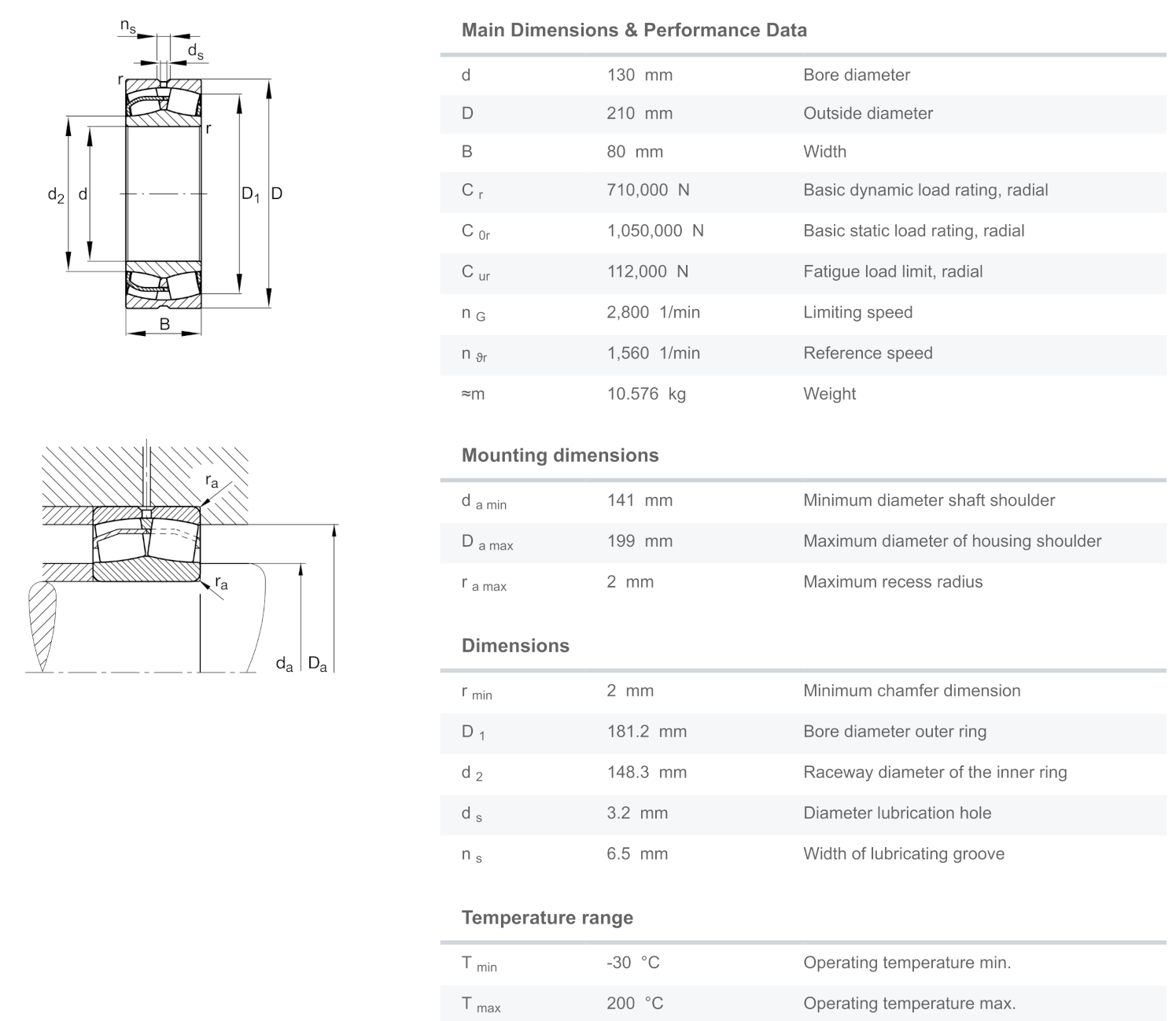 FAG 24126-BE-XL-C3 มีขนาดวงใน 130 มิล วงนอก 210 มิล หนา 80 มิล เป็นตลับลูกปืนเม็ดโค้งสองแถวแบบให้ตัวได้ แกนในรูตรง มีรูสำหรับเติมจารบีได้ สามารถรองรับแรงโหลดสูงทั้งในแนวรัศมีและแนวแกน