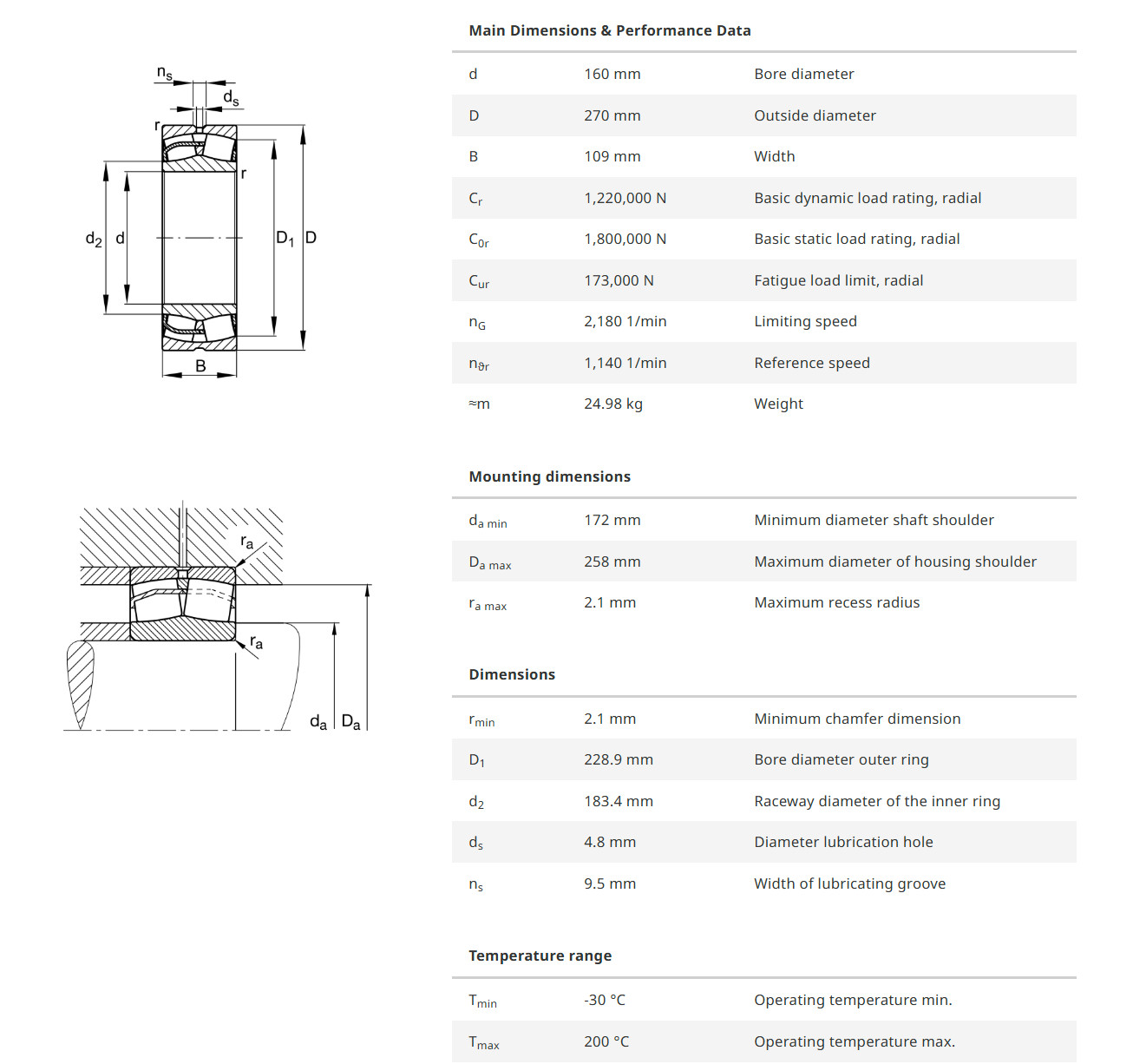 FAG 24132-BE-XL-C3 มีขนาดวงใน 160 มิล วงนอก 270 มิล หนา 109 มิล เป็นตลับลูกปืนเม็ดโค้งสองแถวแบบให้ตัวได้ แกนในรูตรง มีรูสำหรับเติมจารบีได้ สามารถรองรับแรงโหลดสูงทั้งในแนวรัศมีและแนวแกน
