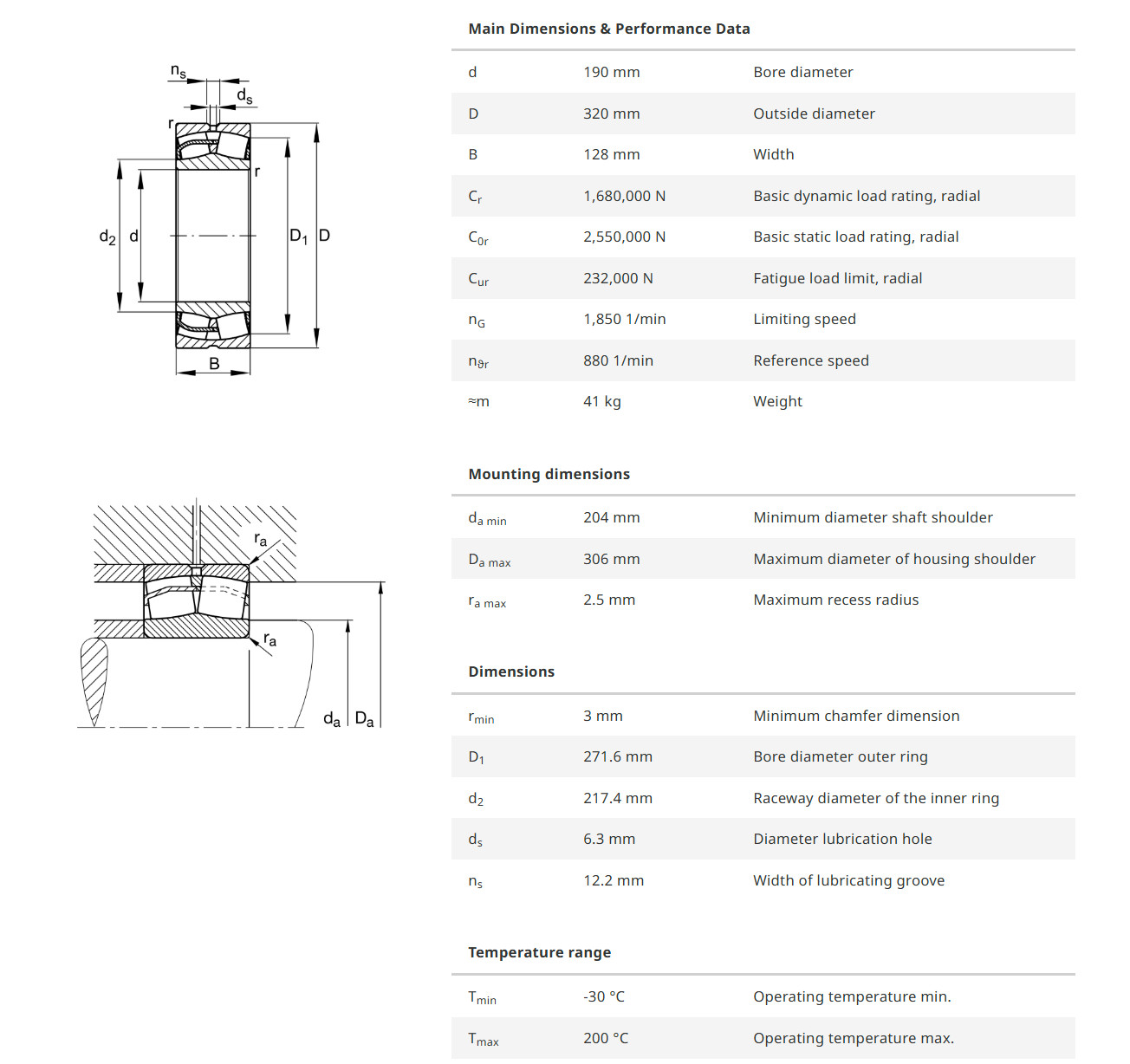 FAG 24138-BE-XL-C3 มีขนาดวงใน 190 มิล วงนอก 320 มิล หนา 128 มิล เป็นตลับลูกปืนเม็ดโค้งสองแถวแบบให้ตัวได้ แกนในรูตรง มีรูสำหรับเติมจารบีได้ สามารถรองรับแรงโหลดสูงทั้งในแนวรัศมีและแนวแกน เหมาะสำหรับใช้งานกับอุตสาหกรรมหนัก