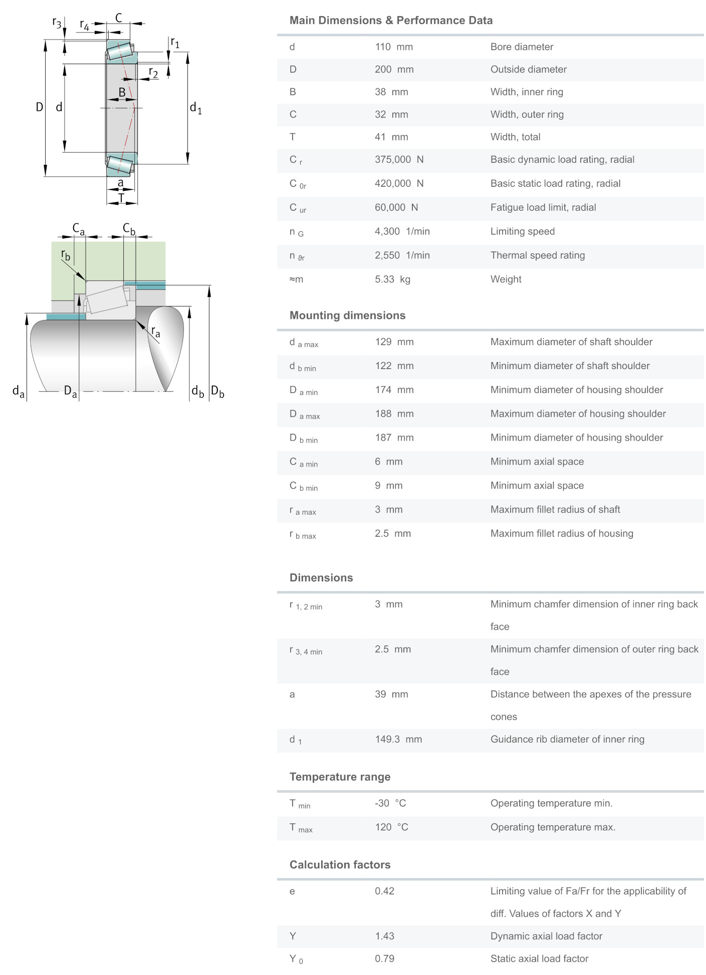 FAG 30222-XL มีขนาดวงใน 110 มิล วงนอก 200 มิล หนารวม 41 มิล เป็นตลับลูกปืนเม็ดเรียว หรือที่เรียกว่า เตเปอร์ (Tapered) แกนนอกมีลักษณะเป็นปลอกคล้ายถ้วย (Cup) แยกออกจากตัวลูกปืน(Cone)ได้ ทำให้สะดวกต่อการติดตั้ง สามารถรองรับแรงโหลดได้สูงทั้งแนวรัศมีและแนวแกน