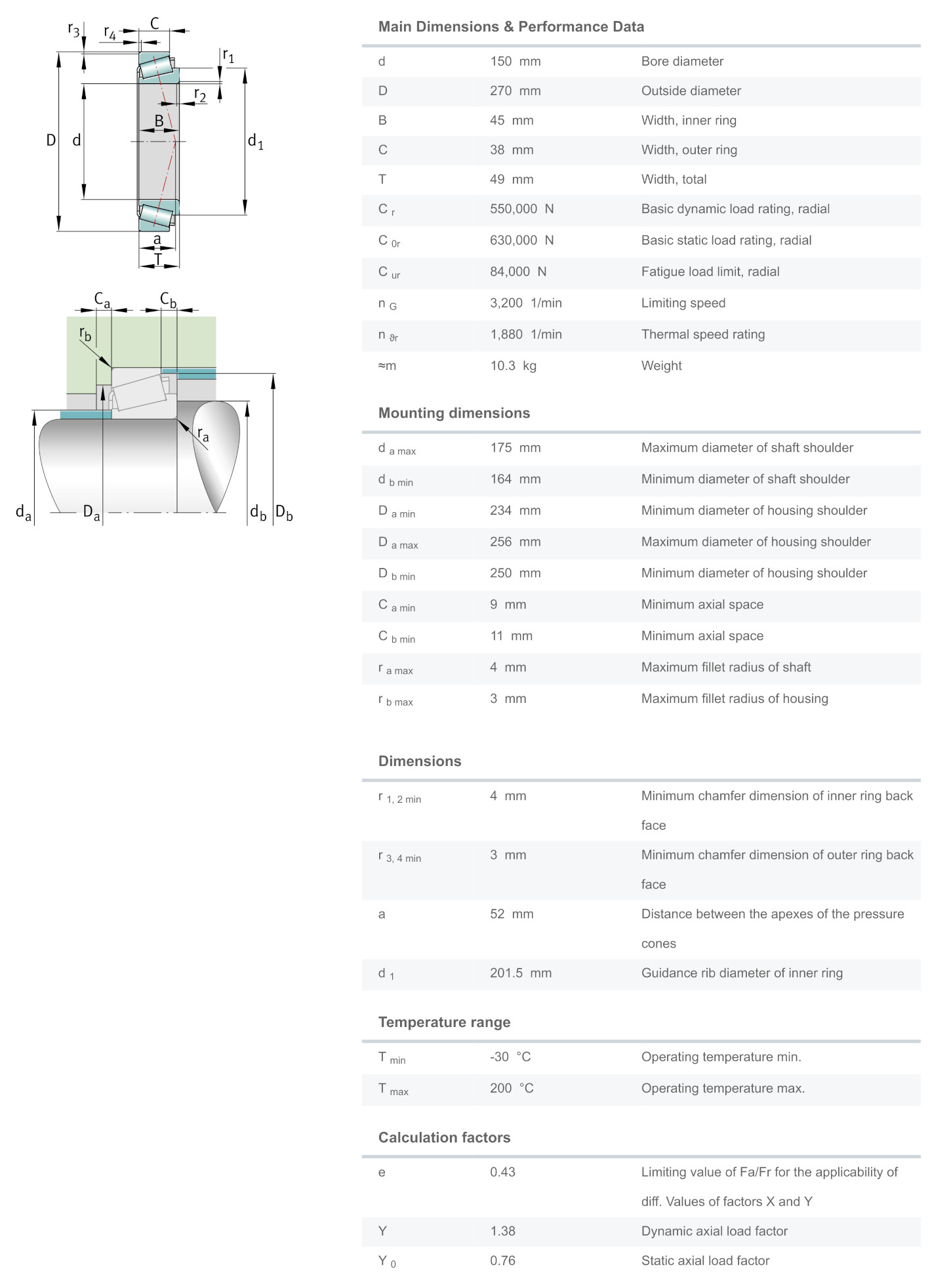 FAG 30230-XL มีขนาดวงใน 150 มิล วงนอก 270 มิล หนารวม 49 มิล เป็นตลับลูกปืนเม็ดเรียว หรือที่เรียกว่า เตเปอร์ (Tapered) แกนนอกมีลักษณะเป็นปลอกคล้ายถ้วย (Cup) แยกออกจากตัวลูกปืน(Cone)ได้ ทำให้สะดวกต่อการติดตั้ง สามารถรองรับแรงโหลดได้สูงทั้งแนวรัศมีและแนวแกน