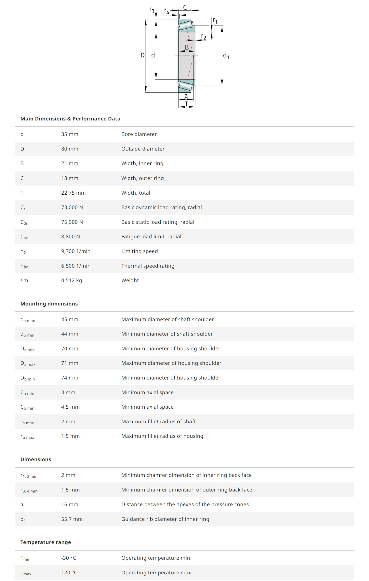 FAG 30307-A มีขนาดวงใน 35 มิล วงนอก 80 มิล หนารวม 22.75 มิล เป็นตลับลูกปืนเม็ดเรียว หรือที่เรียกว่า เตเปอร์ (Tapered) แกนนอกมีลักษณะเป็นปลอกคล้ายถ้วย (Cup) แยกออกจากตัวลูกปืน(Cone)ได้ ทำให้สะดวกต่อการติดตั้ง สามารถรองรับแรงโหลดได้สูงทั้งแนวรัศมีและแนวแกน