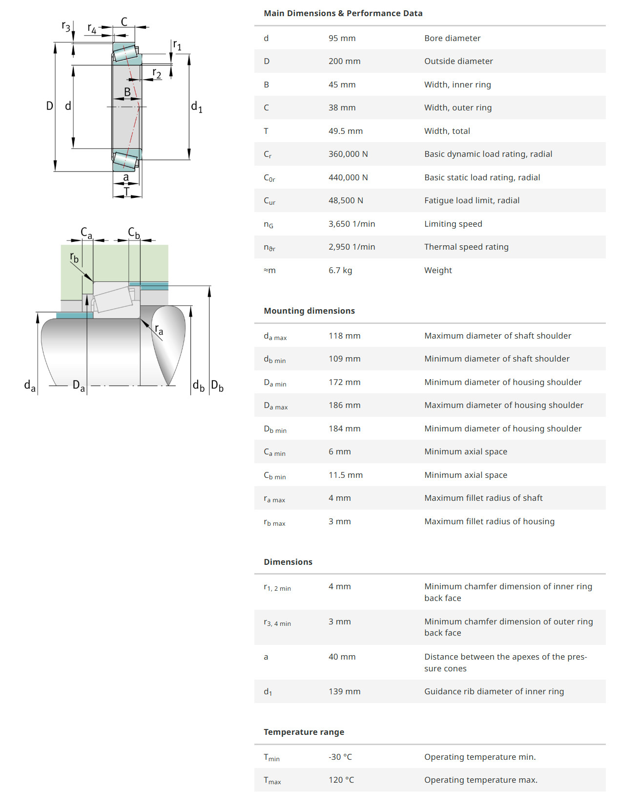 FAG 30319-A มีขนาดวงใน 95 มิล วงนอก 200 มิล หนารวม 49.5 มิล เป็นตลับลูกปืนเม็ดเรียว หรือที่เรียกว่า เตเปอร์ (Tapered) แกนนอกมีลักษณะเป็นปลอกคล้ายถ้วย (Cup) แยกออกจากตัวลูกปืน(Cone)ได้ ทำให้สะดวกต่อการติดตั้ง สามารถรองรับแรงโหลดได้สูงทั้งแนวรัศมีและแนวแกน