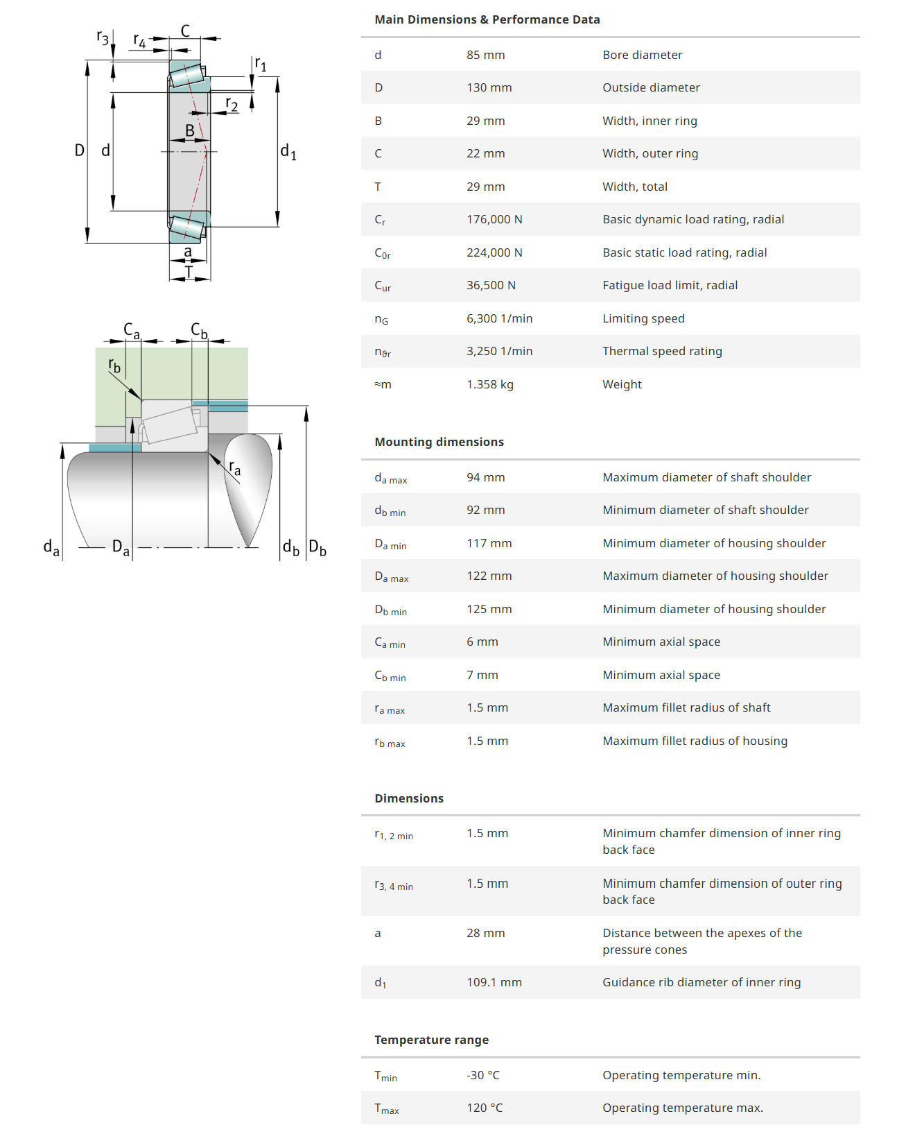 FAG 32017-X-XL มีขนาดวงใน 85 มิล วงนอก 130 มิล หนารวม 29 มิล เป็นตลับลูกปืนเม็ดเรียวหรือที่เรียกว่าเตเปอร์(Tapered) แกนนอกมีลักษณะเป็นปลอกคล้ายถ้วย(Cup) แยกออกจากตัวลูกปืน(Cone) สะดวกต่อการติดตั้ง สามารถรองรับแรงโหลดได้สูง