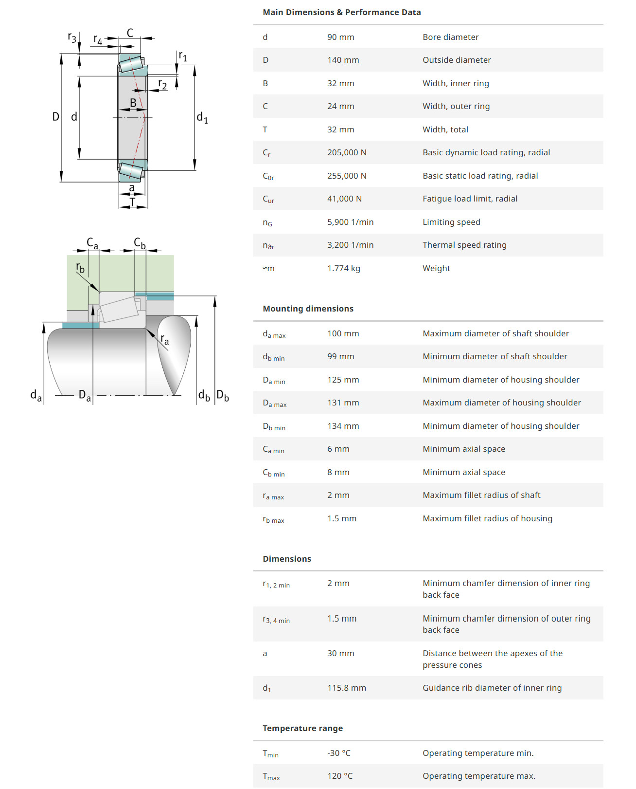 FAG 32018-X-XL มีขนาดวงใน 90 มิล วงนอก 140 มิล หนารวม 32 มิล เป็นตลับลูกปืนเม็ดเรียวหรือที่เรียกว่าเตเปอร์(Tapered) แกนนอกมีลักษณะเป็นปลอกคล้ายถ้วย(Cup) แยกออกจากตัวลูกปืน(Cone) สะดวกต่อการติดตั้ง สามารถรองรับแรงโหลดได้สูง