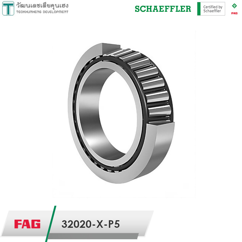 FAG 32020-X-P5 มีขนาดวงใน 100 มิล วงนอก 150 มิล หนารวม 32 มิล เป็นตลับลูกปืนเม็ดเรียว หรือที่เรียกว่า เตเปอร์ (Tapered) แกนนอกมีลักษณะเป็นปลอกคล้ายถ้วย (Cup) แยกออกจากตัวลูกปืน(Cone)ได้ ทำให้สะดวกต่อการติดตั้ง สามารถรองรับแรงโหลดได้สูงทั้งแนวรัศมีและแนวแกน