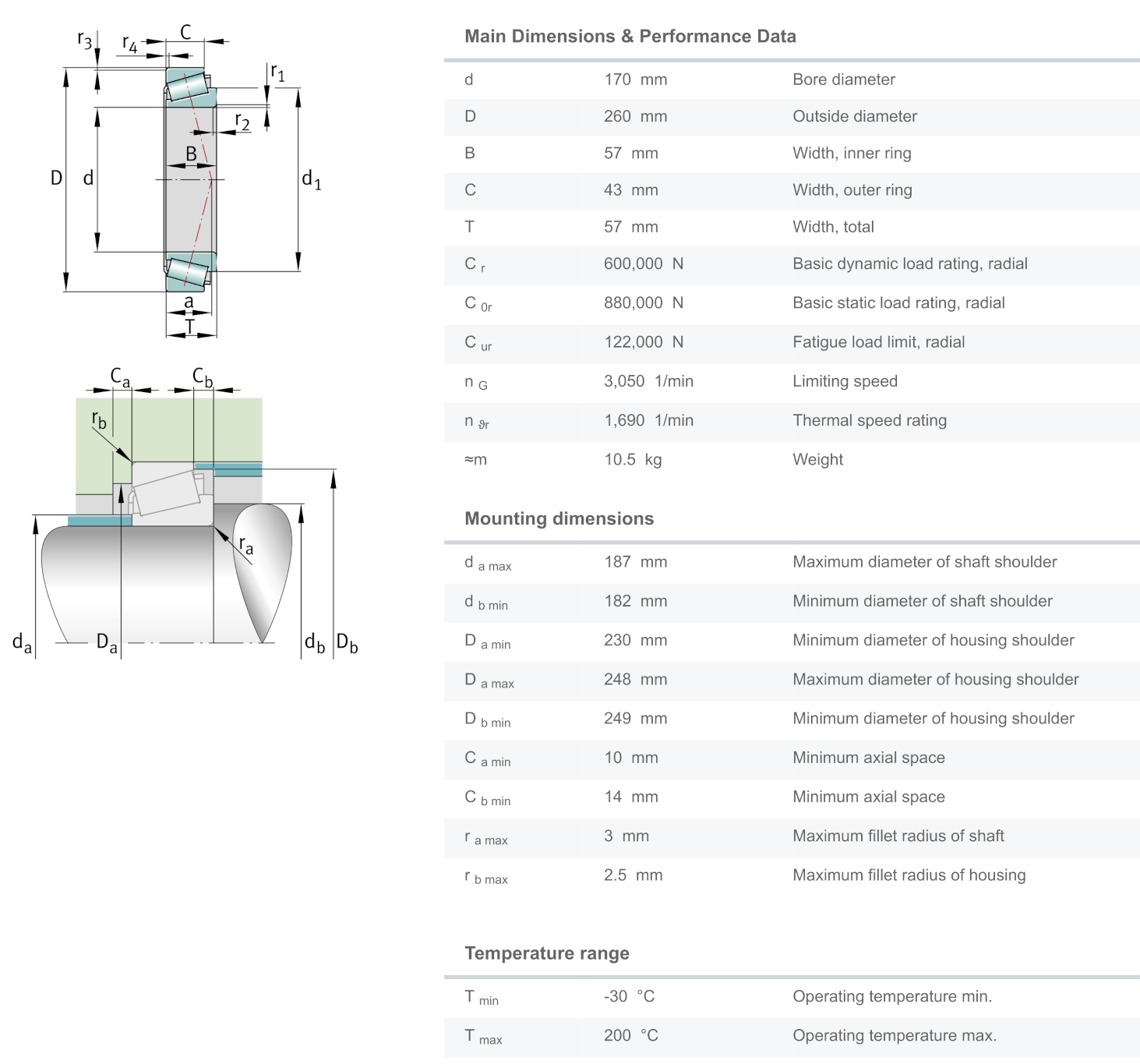 FAG 32034-X-XL มีขนาดวงใน 170 มิล วงนอก 260 มิล หนารวม 57 มิล เป็นตลับลูกปืนเม็ดเรียว หรือที่เรียกว่า เตเปอร์ (Tapered) แกนนอกมีลักษณะเป็นปลอกคล้ายถ้วย (Cup) แยกออกจากตัวลูกปืน(Cone)ได้ ทำให้สะดวกต่อการติดตั้ง สามารถรองรับแรงโหลดได้สูงทั้งแนวรัศมีและแนวแกน