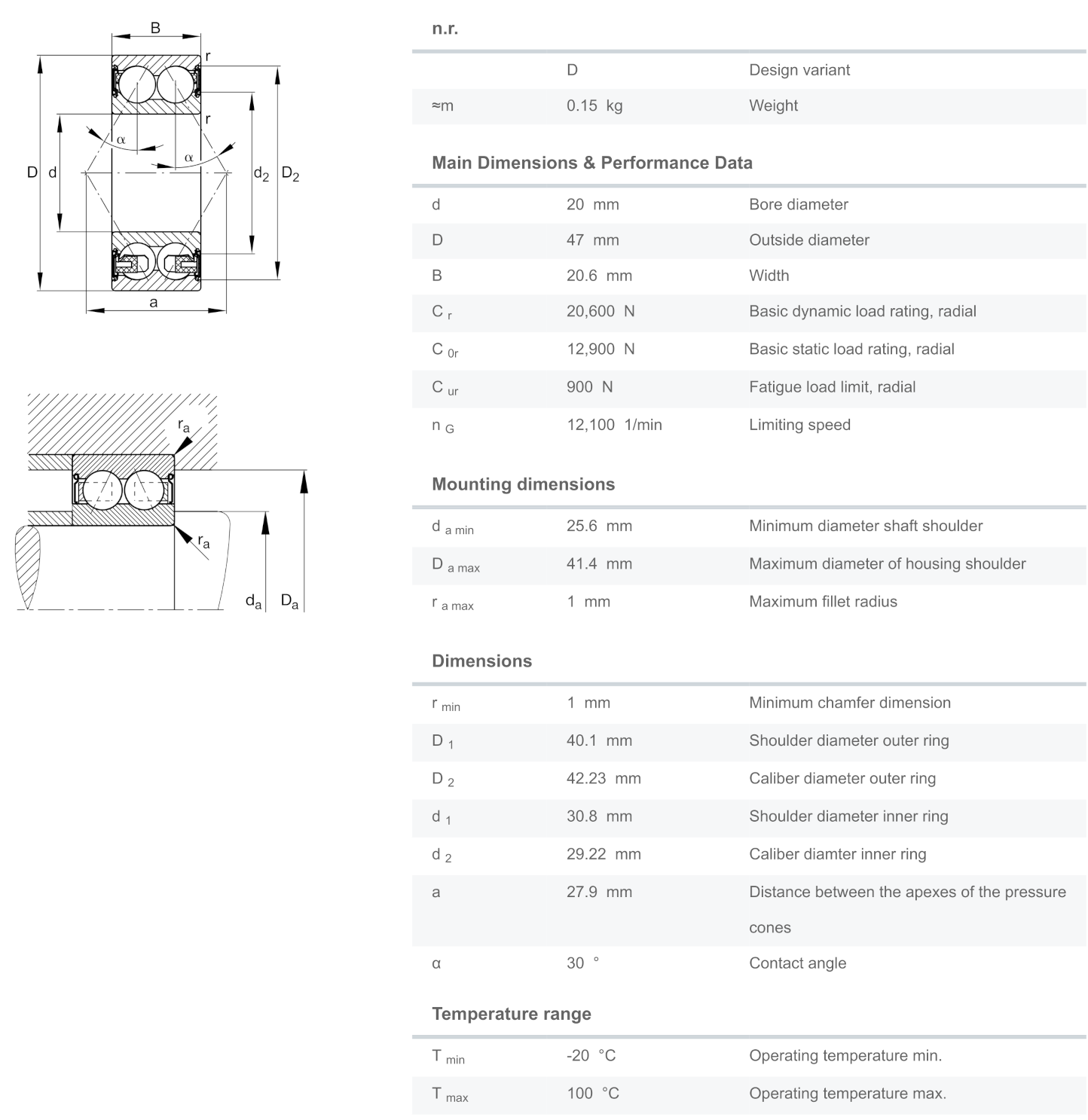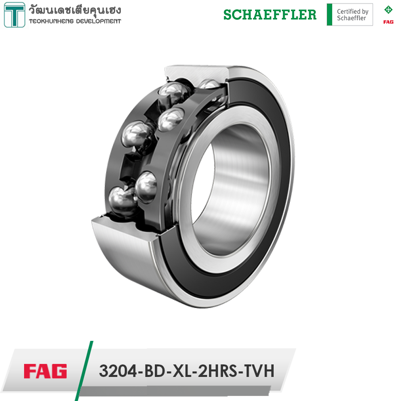 FAG 3204-BD-XL-2HRS-TVH มีขนาดวงใน 20 มิล วงนอก 47 มิล หนา 20.6 มิล เป็นตลับลูกปืนเม็ดกลมแบบมีมุมสัมผัส 30° องศา แบบสองแถว ฝายางสองด้าน เหมาะสำหรับรองรับแรงโหลดได้มากทั้งในแนวรัศมีและแนวแกน