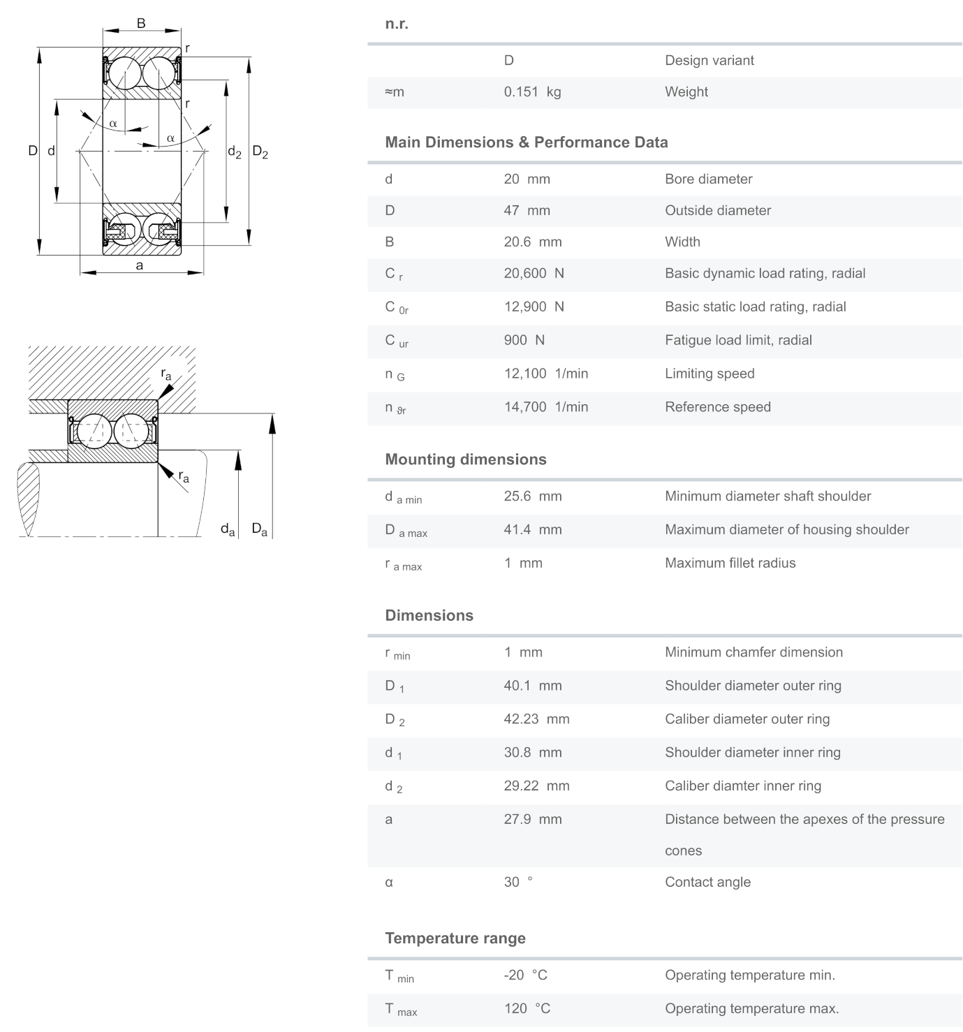 FAG 3204-BD-XL-2Z-TVH มีขนาดวงใน 20 มิล วงนอก 47 มิล หนา 20.6 มิล เป็นตลับลูกปืนเม็ดกลมแบบมีมุมสัมผัส 30° องศา แบบสองแถว ฝาเหล็กสองด้าน เหมาะสำหรับรองรับแรงโหลดได้มากทั้งในแนวรัศมีและแนวแกน