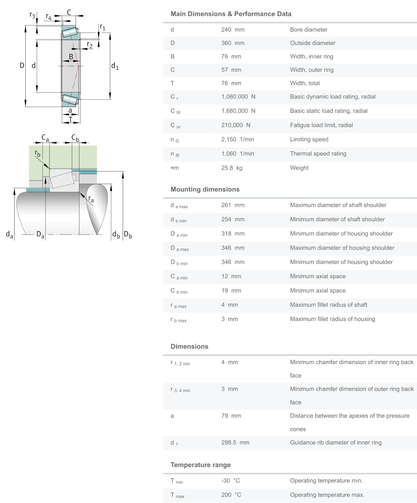 FAG 32048-X-XL มีขนาดวงใน 240 มิล วงนอก 360 มิล หนารวม 76 มิล เป็นตลับลูกปืนเม็ดเรียว หรือที่เรียกว่า เตเปอร์ (Tapered) แกนนอกมีลักษณะเป็นปลอกคล้ายถ้วย (Cup) แยกออกจากตัวลูกปืน(Cone)ได้ ทำให้สะดวกต่อการติดตั้ง สามารถรองรับแรงโหลดได้สูงทั้งแนวรัศมีและแนวแกน