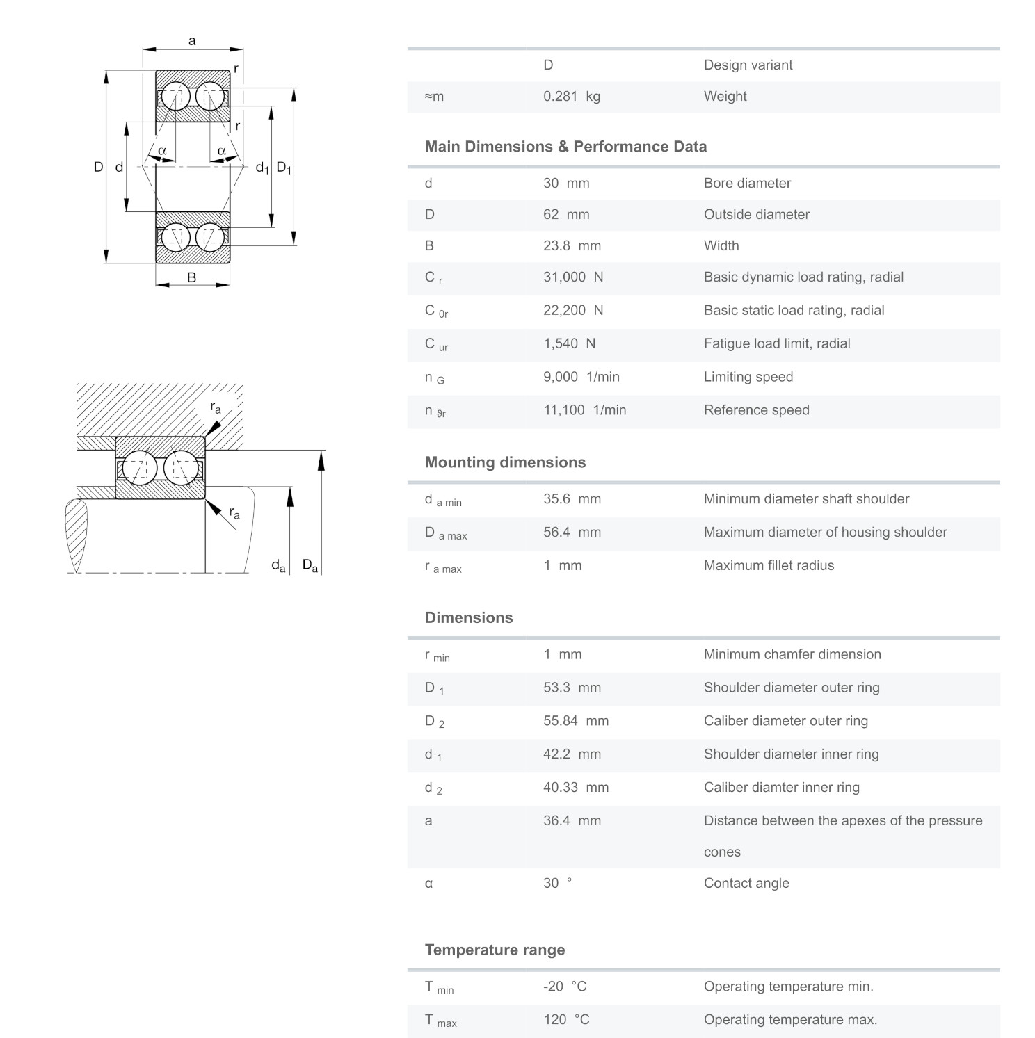 FAG 3206-BD-XL-TVH-L285 มีขนาดวงใน 30 มิล วงนอก 62 มิล หนา 23.8 มิล เป็นตลับลูกปืนเม็ดกลมแบบมีมุมสัมผัส 30° องศา แบบสองแถว เหมาะสำหรับรองรับแรงโหลดได้มากทั้งในแนวรัศมีและแนวแกน