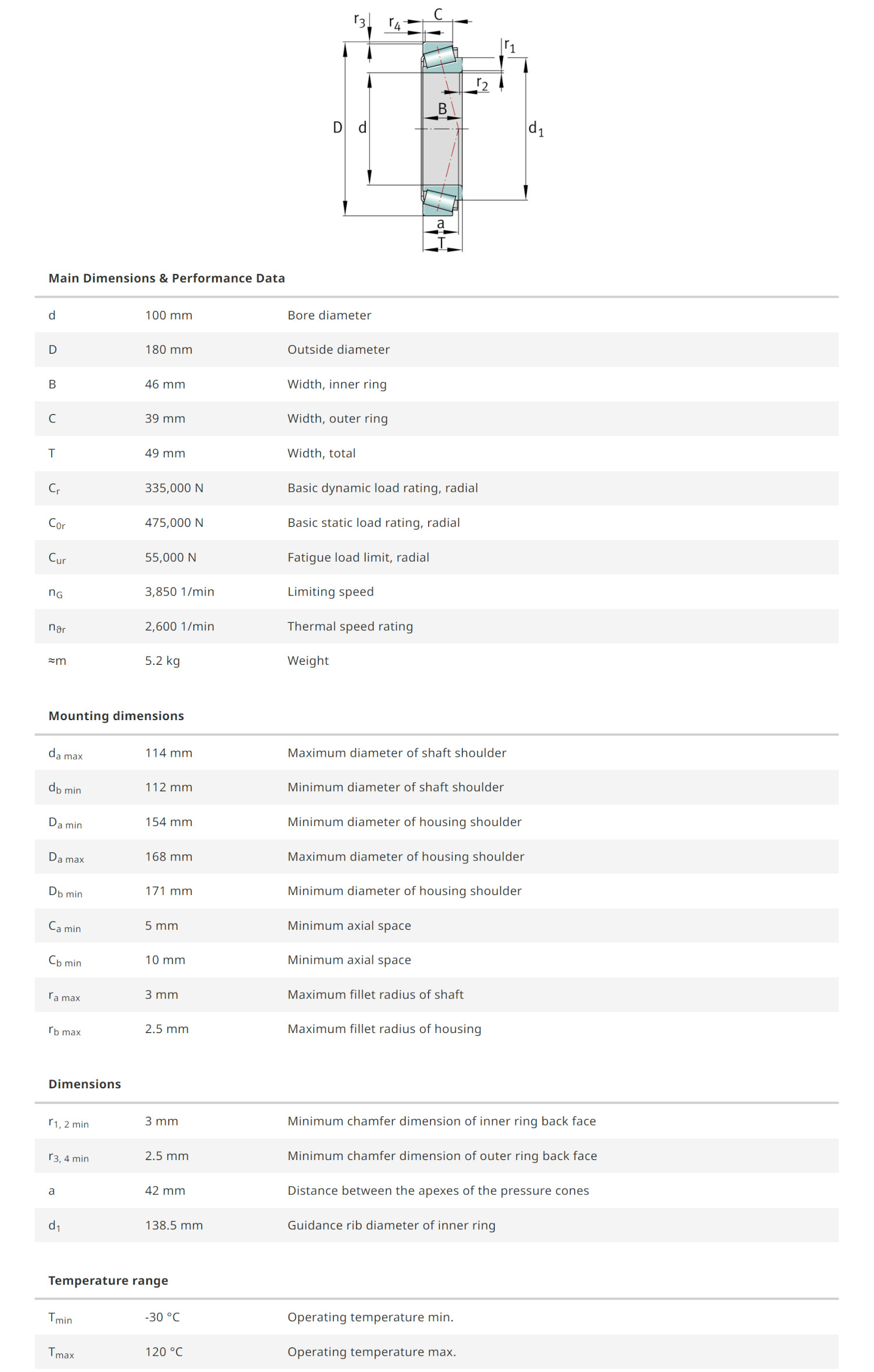 FAG 32220-A มีขนาดวงใน 100 มิล วงนอก 180 มิล หนารวม 49 มิล เป็นตลับลูกปืนเม็ดเรียว หรือที่เรียกว่า เตเปอร์ (Tapered) แกนนอกมีลักษณะเป็นปลอกคล้ายถ้วย (Cup) แยกออกจากตัวลูกปืน(Cone)ได้ ทำให้สะดวกต่อการติดตั้ง สามารถรองรับแรงโหลดได้สูงทั้งแนวรัศมีและแนวแกน