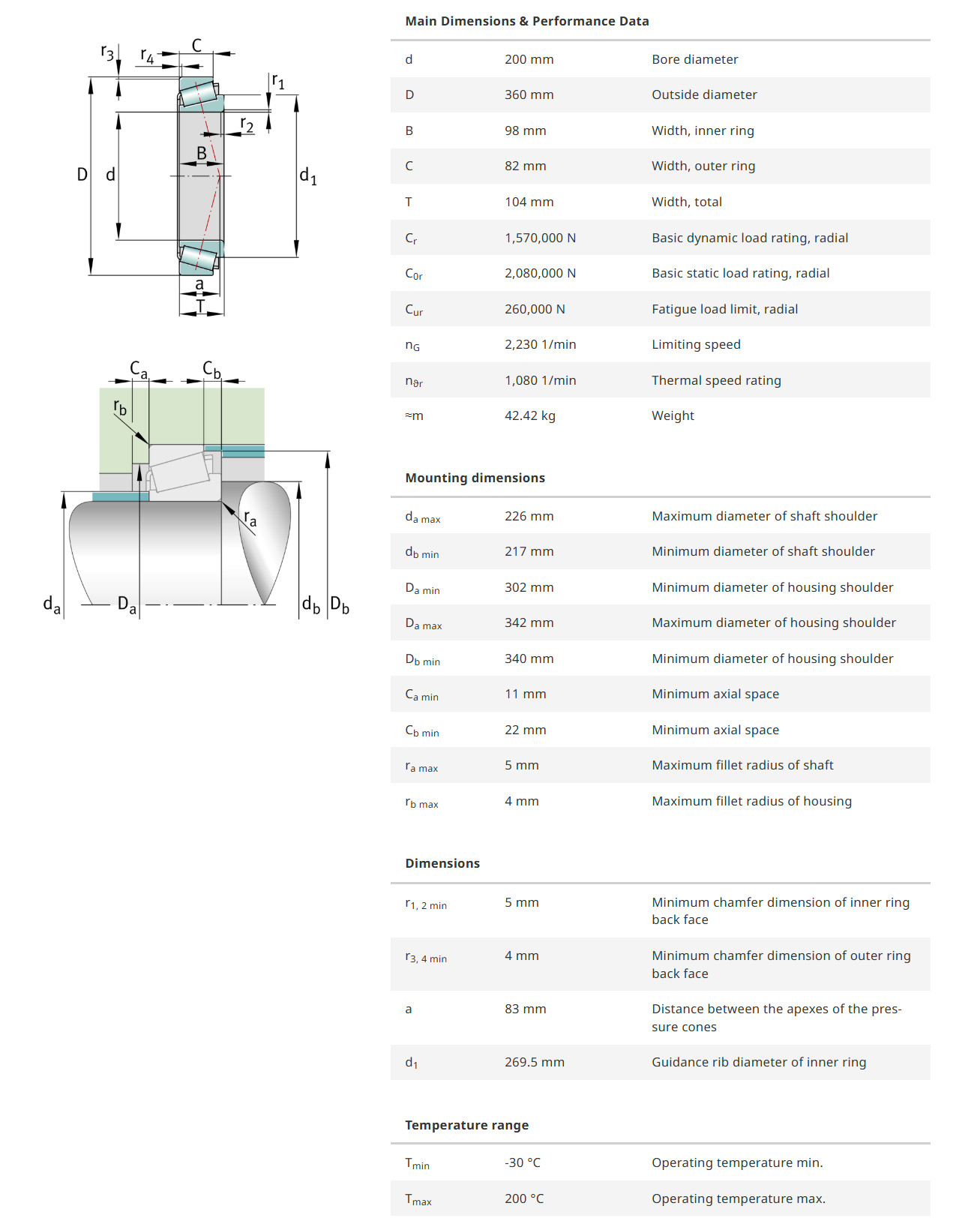 FAG 32240-XL มีขนาดวงใน 200 มิล วงนอก 360 มิล หนารวม 104 มิล เป็นตลับลูกปืนเม็ดเรียว หรือที่เรียกว่า เตเปอร์ (Tapered) แกนนอกมีลักษณะเป็นปลอกคล้ายถ้วย (Cup) แยกออกจากตัวลูกปืน(Cone)ได้ ทำให้สะดวกต่อการติดตั้ง สามารถรองรับแรงโหลดได้สูงทั้งแนวรัศมีและแนวแกน