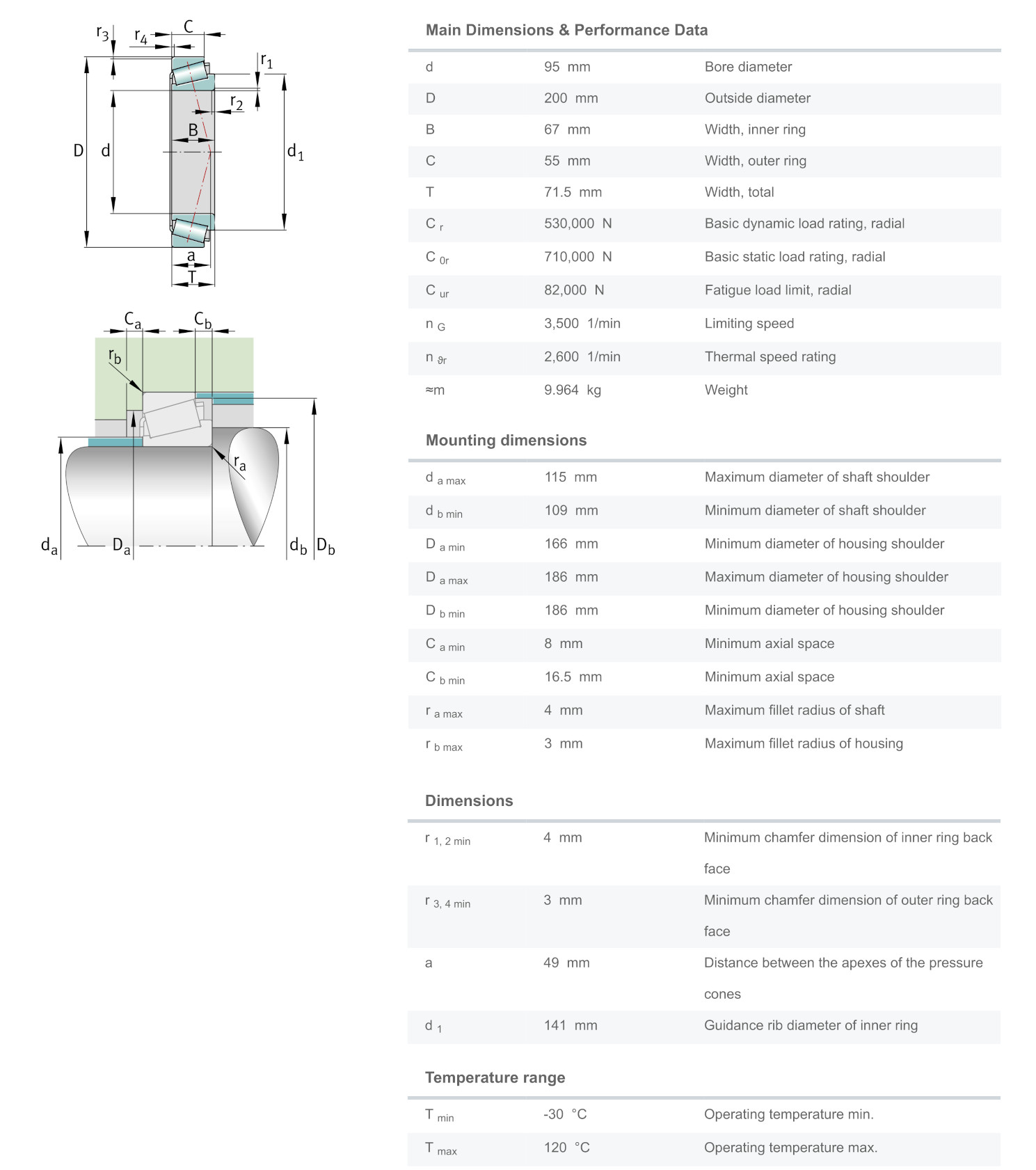 FAG 32319-A มีขนาดวงใน 95 มิล วงนอก 200 มิล หนารวม 71.5 มิล เป็นตลับลูกปืนเม็ดเรียว หรือที่เรียกว่า เตเปอร์ (Tapered) แกนนอกมีลักษณะเป็นปลอกคล้ายถ้วย (Cup) แยกออกจากตัวลูกปืน(Cone)ได้ ทำให้สะดวกต่อการติดตั้ง สามารถรองรับแรงโหลดได้สูงทั้งแนวรัศมีและแนวแกน